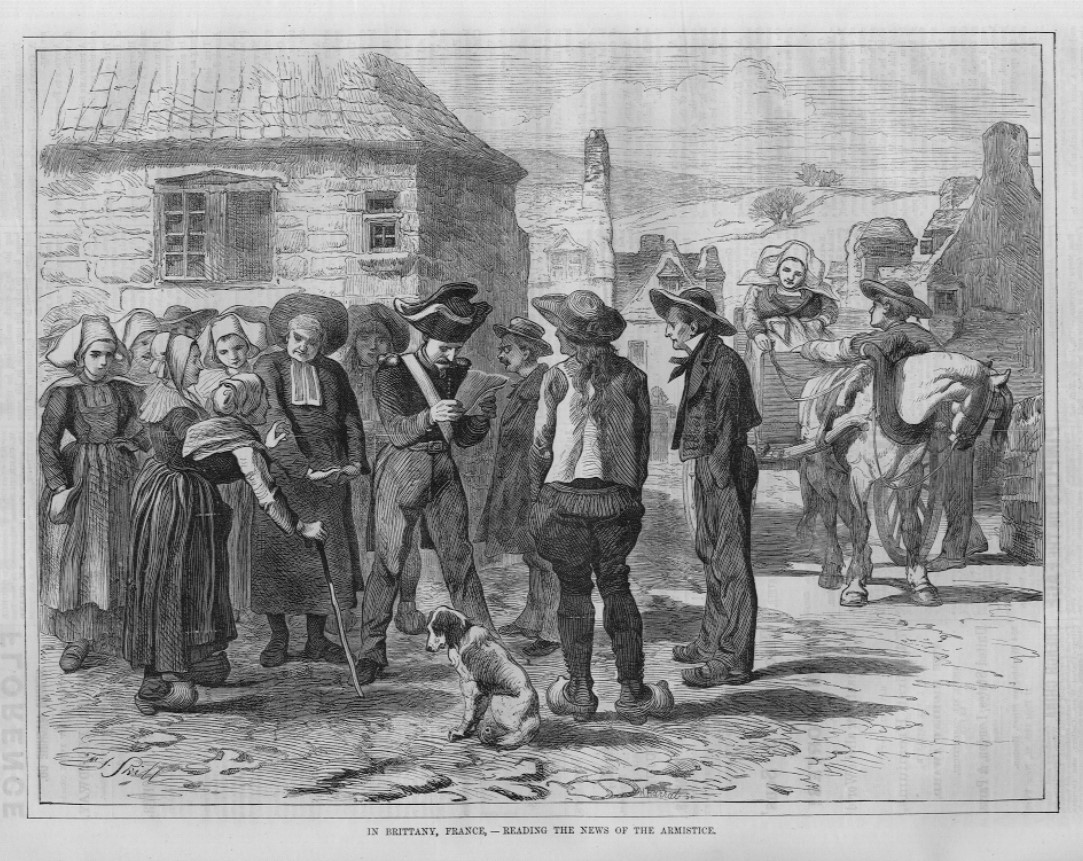 This genuine antique wood-cut engraving is titled "IN BRITTANY FRANCE - READING THE NEWS OF THE ARMISTICE", published in "Every Saturday" March 1871. This dated engraving from the year of 1871 is 9 x 12 inches in size. It is in excellent condition, highly displayable and ready for framing and is guaranteed to be as described. I do not deal in copies/reproductions.