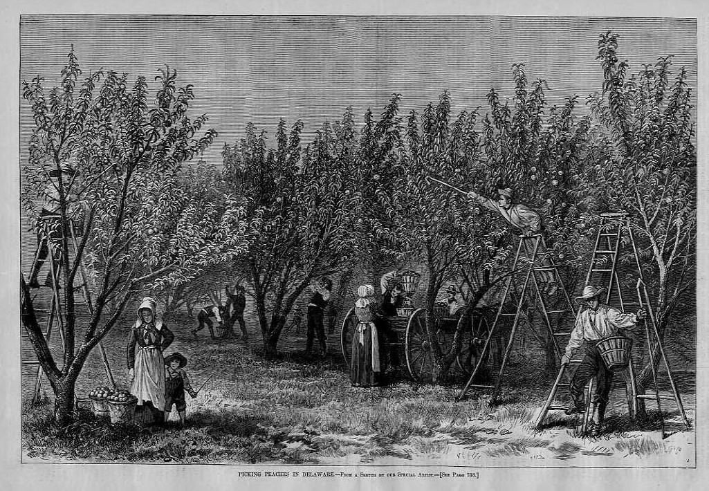 This genuine antique engraving is titled "PICKING PEACHES PEACHES IN DELAWARE", published in "Harper's Weekly" September 1878. This dated engraving from the year of 1878 is 11 x 15 inches in size with wide margins. It is in excellent condition, highly displayable and ready for framing and is guaranteed to be as described.