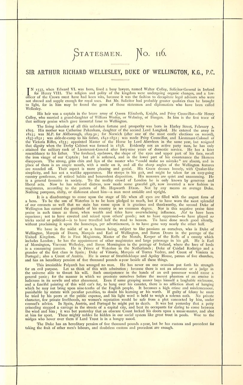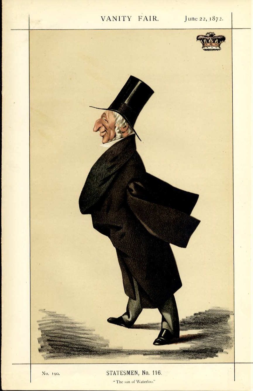 This original antique Vanity Fair colored lithograph caricature is titled "THE SON OF WATERLOO", published in "Vanity Fair" June 1872. The image size of this dated lithograph from the year of 1872 is 8 x 12 inches. The complete page is 9 x 14 inches in size and on a thick paper stock. It is in excellent condition, highly displayable and ready for framing and will include the accompanying text as published. This lithograph is guaranteed to be as described. This is not a reprint as I do not deal in copies/reproductions.