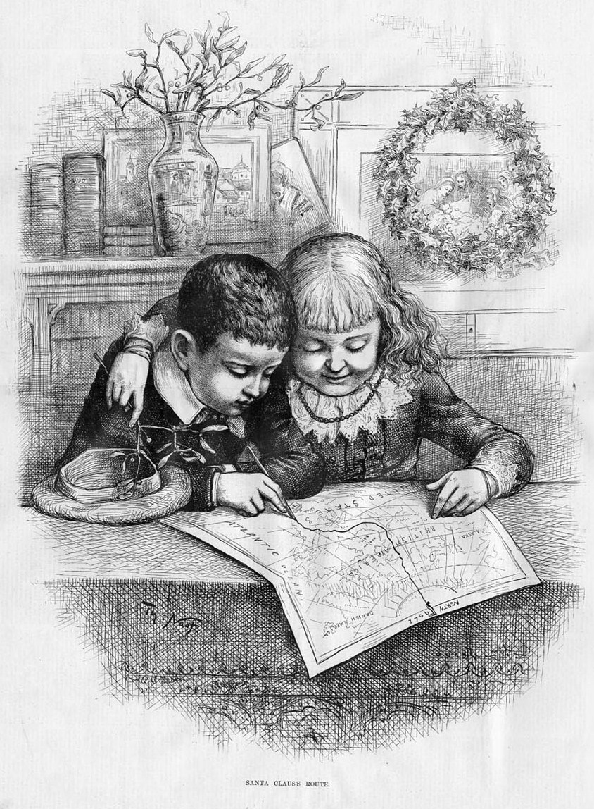 This genuine antique engraving/print is titled "SANTA CLAUS'S ROUTE", by THOMAS NAST, published in "Harper's Weekly" December 1885. This dated engraving from the year of 1885 is a HUGE 15 x 21 inches in size with wide margins. It is in excellent condition, highly displayable and ready for framing and is guaranteed to be as described.