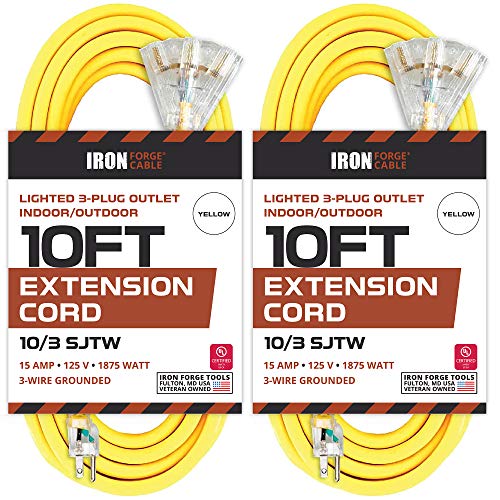 Iron Forge Cable's 10 Ft Outdoor Extension Cord is the perfect all-purpose power cord for your indoor and outdoor electrical needs. The 3 power outlets let you power multiple devices at the same time. The lighted plugs make it easy to see, even in the dark. And the cord's 10 foot length gives you good reach across your garden or home. UL Listed.