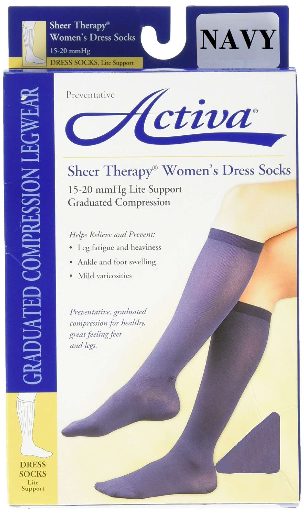 Activa's Sheer Therapy® graduated compression is designed to give 15-20 mmHg support to help prevent and relieve tired, aching legs, ankle and leg swelling, and slight varicosities.