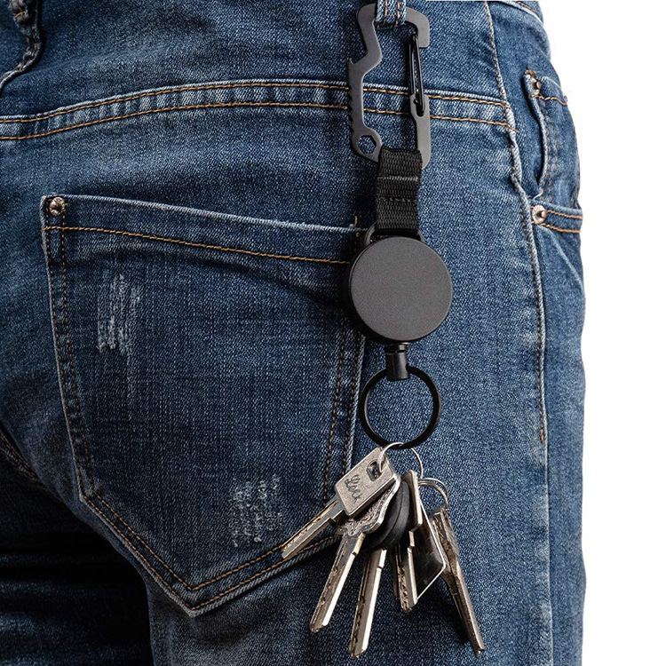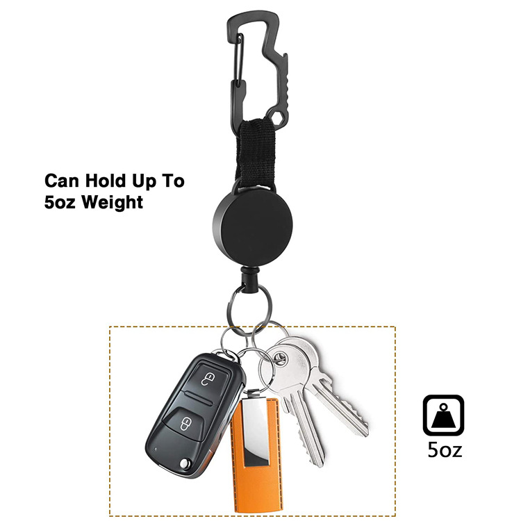 Feature: Color:Black Features: Bottle Opener, Carabiner Clip, Retractable Material: Stainless Steel Carabiner + ABS Case + Stainless Steel Cord Holder Diameter: 4.1cm/1.6" Key Chain:15.5cm/6.1" Wire Length: approx.60cm/23.62" Wire Thickness: about 0.6mm Theme: Anti Lost Featured Refinements: Key Ring Package Included: 1/2/3/5pcs Retractable Keyring Carabiner Clip Description: EASILY ACCESS KEYS & BADGES - badge reel with carabiner clip for quick access, keeps your keys, ID badges, RFID key card, identification tags, security swipe card and small tools readily reachable and securely in place. And it is easily clip on to belts, pockets, purse straps, backpacks or anywhere you like. Retractable 25 inch steel cord for a smooth extension, so wherever you clip on, It allows quick and easy access without tangling the cord. HEAVY DUTY CONSTRUCTION - A longer life! Consists of a metal carabiner, ABS case, extra strength stainless steel cord, heavy-duty steel inner spring, reinforced straps that can last long under heavy use. They are solid enough to bear more than 100,000 pulls, can easily support 5oz without sliding down. MULTI-PURPOSE - Upgraded hook Lets you attach not just keys & ID cards but also can be used as a bottle opener and wrench, very convenient for work and outdoor use. SECURE KEYS, ID AND MORE! - It's the perfect organizational tool for student contractor officer and worker. You'll never have to fumble through your pockets for what you need! With your keys & badges securely attached, you do not need to worry about misplacing important personal items!