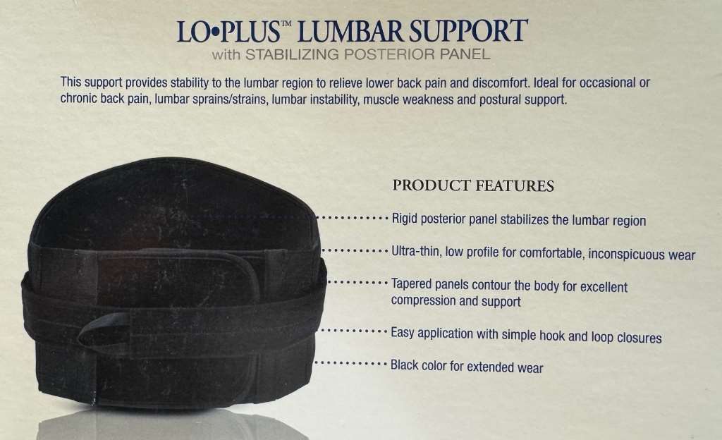 Description : The FLA ProLite LoPlus Lumbar Support provides abdominal compression and support to relieve lower back pain and discomfort. It includes a rigid posterior panel which provides stability to the lumbar region and covers L1-L5 vertebrae.