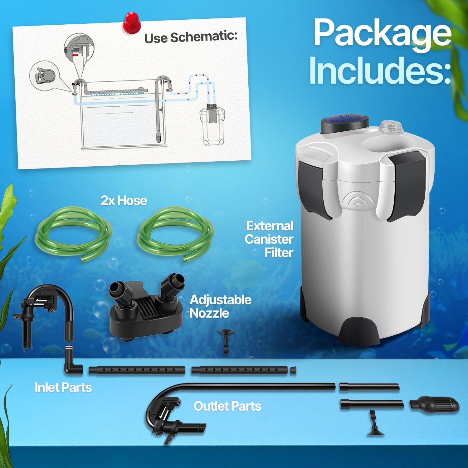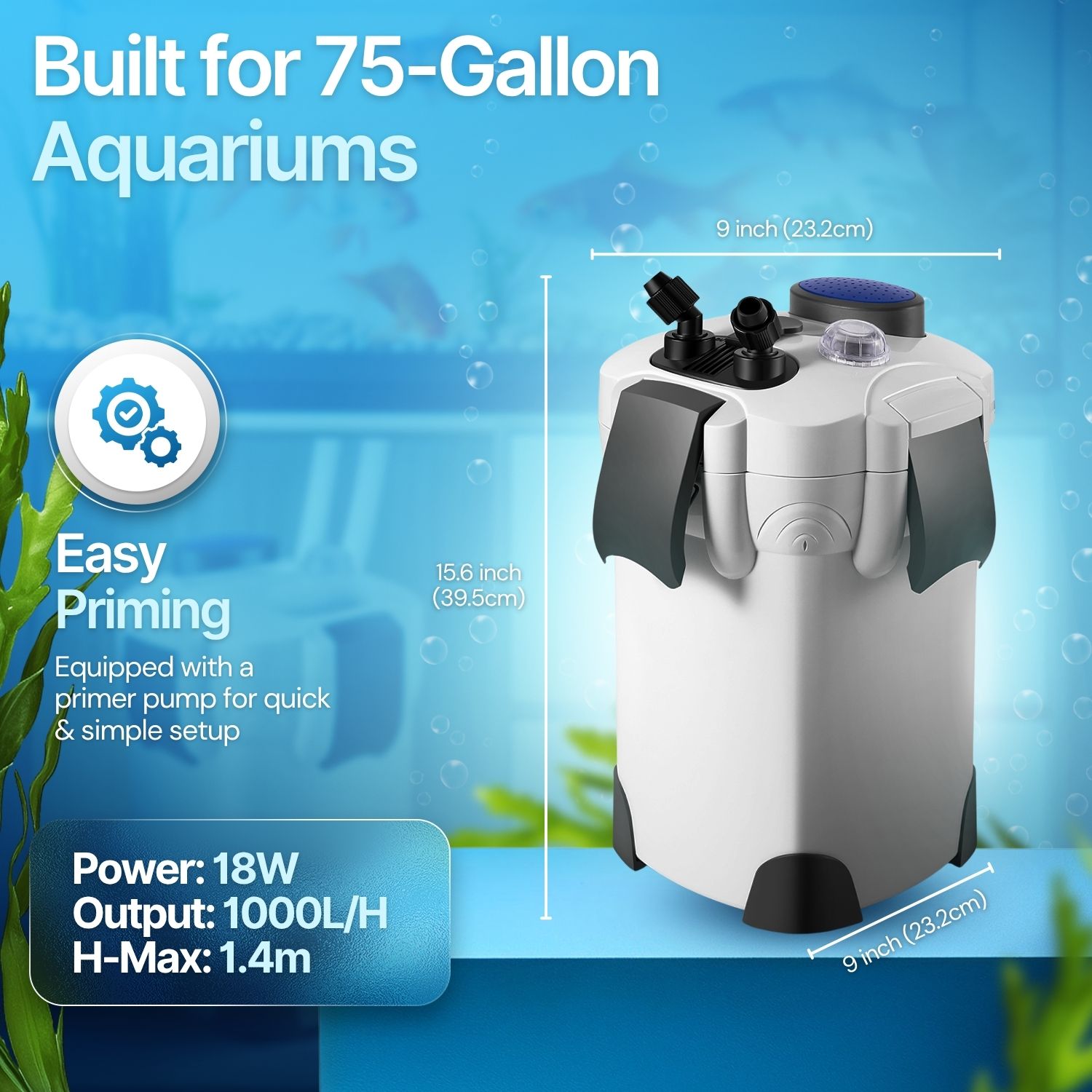 The Flexzion 265GPH Aquarium Canister Filter is perfect for fish tanks up to 75 gallons, designed to foster a balanced and healthy aquatic environment. The advanced biological filtration system of our canister filter for fish tanks features Biospheres & Ceramic Rings helps ensure clean, healthy water for fish and turtles. Our turtle canister filter has an adjustable spray bar that enhances circulation, and the ultra-quiet operation of external filter for aquarium makes it ideal for home or office settings. With an easy-to-use primer pump for hassle-free setup and maintenance, our external aquarium filter offers unbeatable value and performance for maintaining a pristine aquatic habitat.Feature: