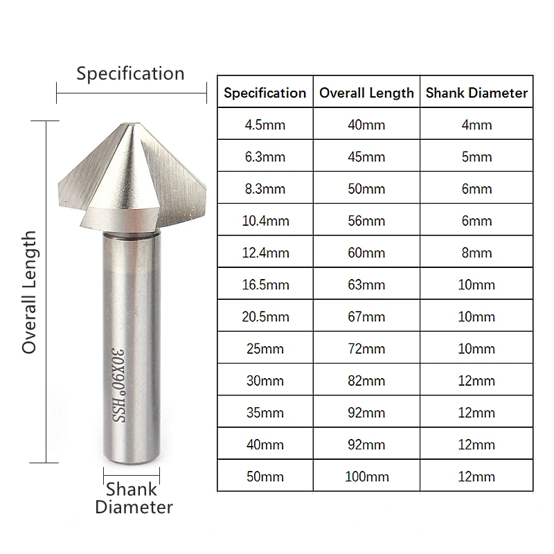 Specification : 4.5mm、6.3mm、8.3mm、10.4mm、12.4mm、16.5mm、20.5mm、25mm、30mm、35mm、40mm、45mm、50mm。 Material: HSS(6542/M2) Shank: round handle Color: as picture shows Quantity: 1PC / 3 flute countersink drill Uses: used in the hole of the workpiece 90 degrees chamfer or taper. You can complete cone processing for small amount of cutting machining
