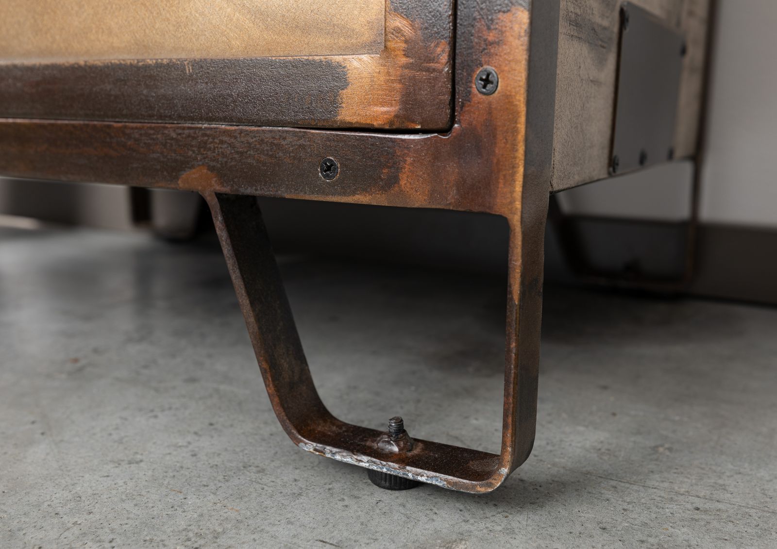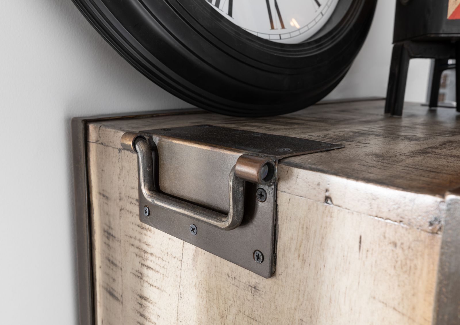 - schöne Details im Factory Look: Nieten, Rahmen sowie Griffe und Füße aus Metall