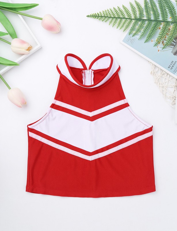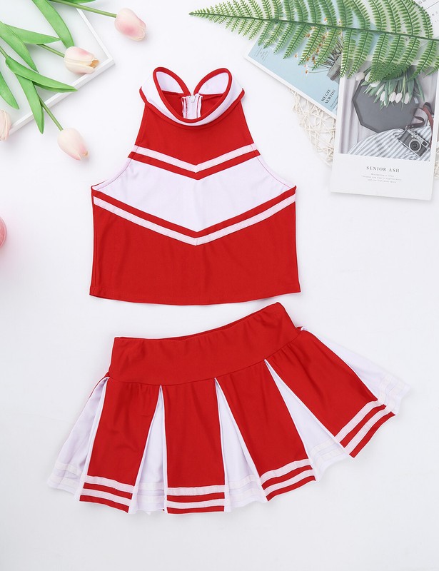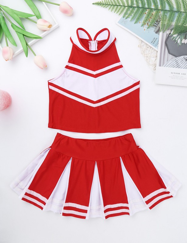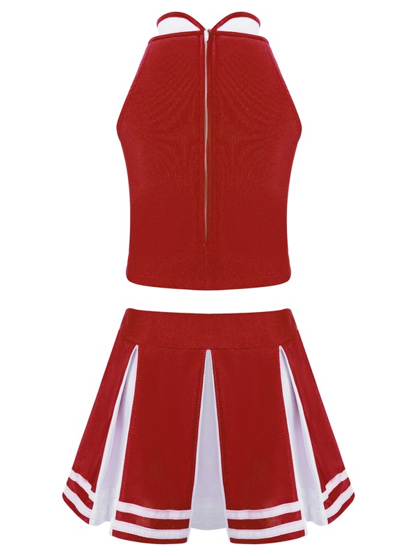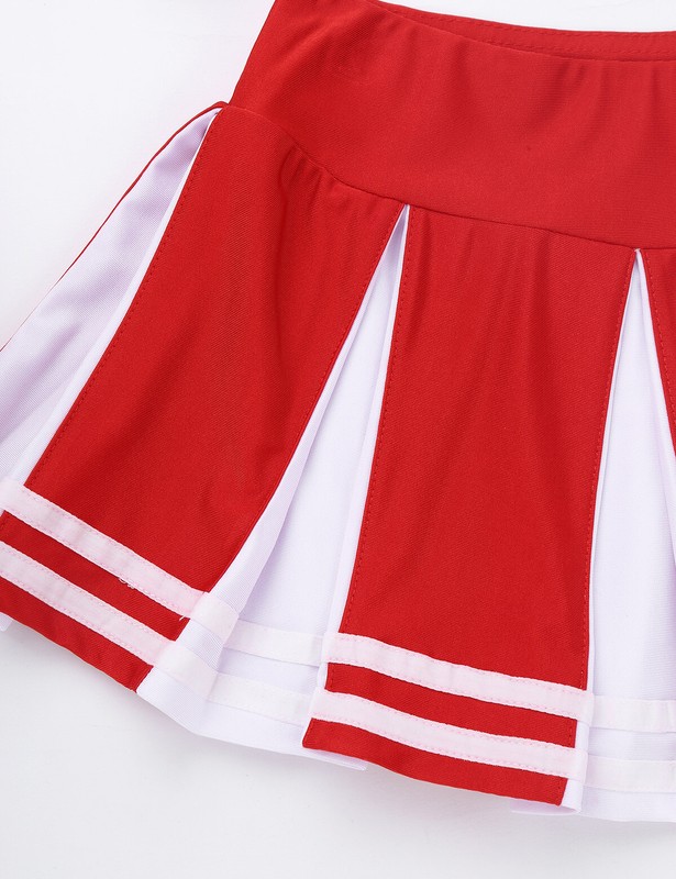 Matching wide elastic waistband skirt with knife pleated design. Beautiful cheerleading costume for your girl.