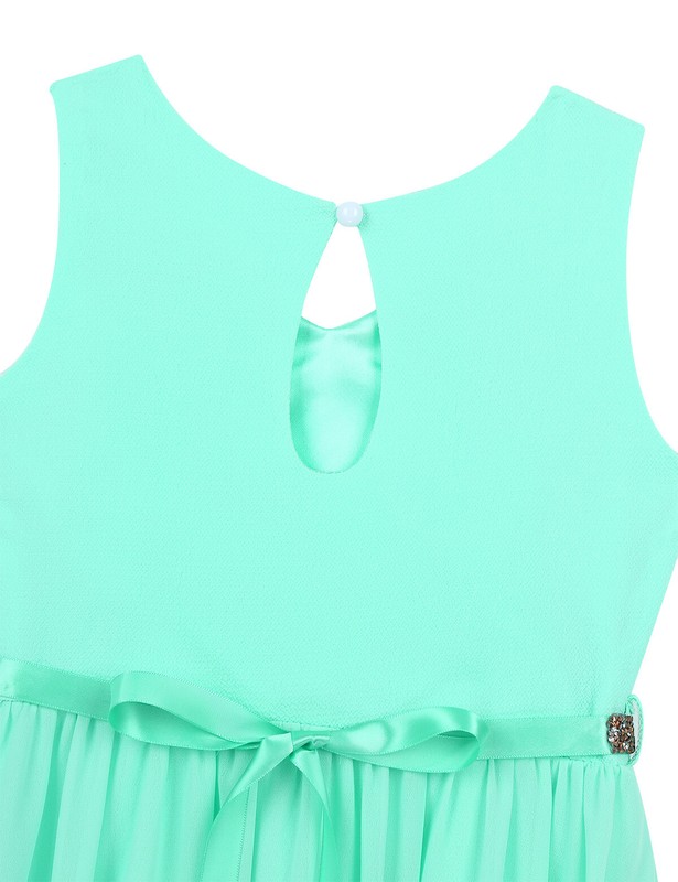 1 layer maxi length chiffon overlay is attached around the waist. Comes with a rhinestone belt to complete the set. Beautiful and stylish dress for your girl.