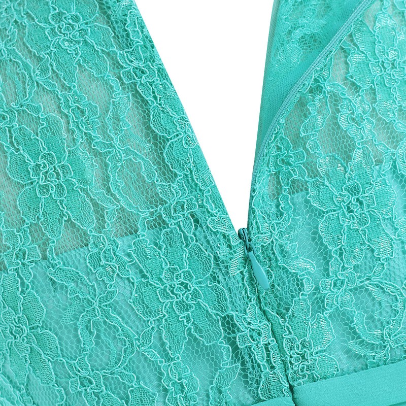 Floral lace top bodice, ruched high-waisted design.