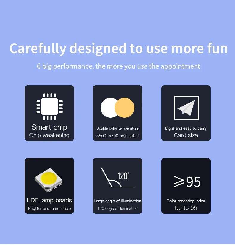 * 【TLCI 95+/ CRI 96+】 Manbily beats original mini on-camera lights on CRI and TLCI, making the photo works much closer to nature and restores the color of the subject itself perfectly with a wide 120° beam angle that outputs 4000 lux at 0.3m