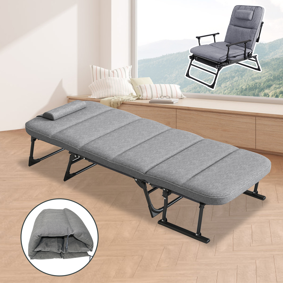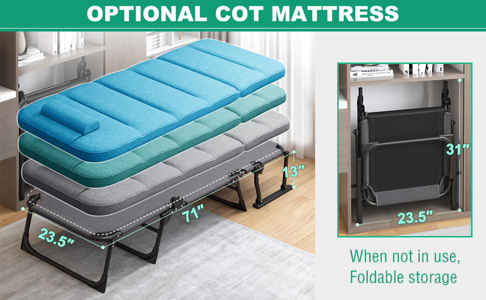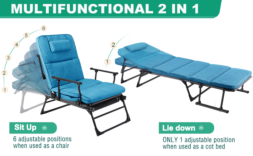 DESIGNED FOR COMFORT: Equipped with 2 Sided mattress, you can sleep more comfortably in this portable folding camping bed. Soft cushions add extra comfort, you will feel more comfortable and warm during sleep in fall and winter. In hot weather, the cushion can also be taken away for the breathable. It has a side pocket, to place your phone, books or keys; the pillow is detachable, can be adjustable up and down or removed based on your own needs;