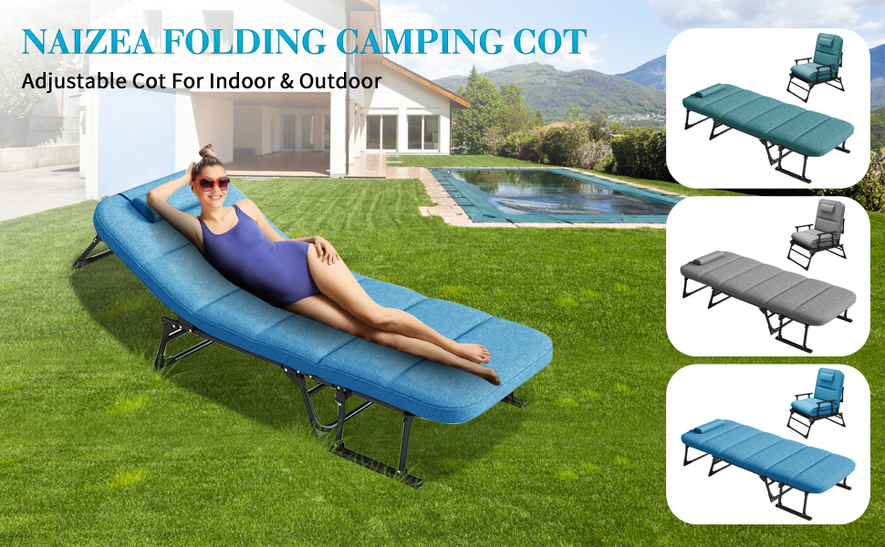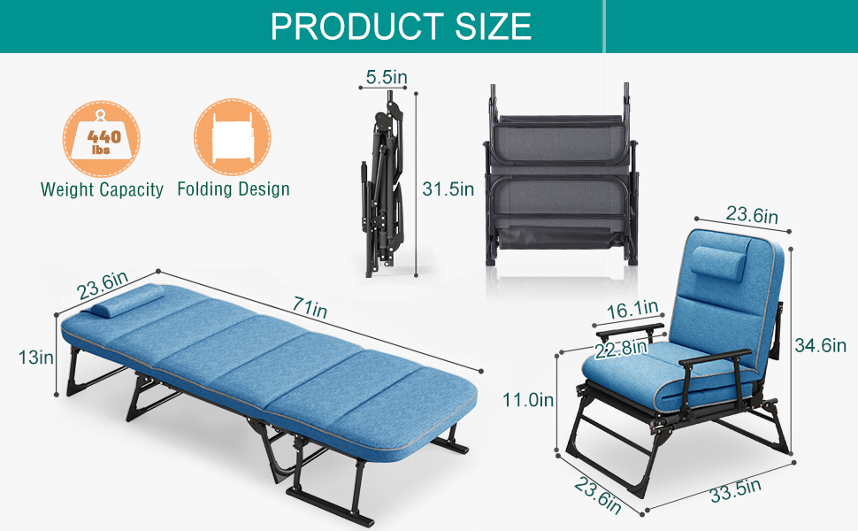 Portable Adjustable folding cot unfold size: L75.2"xW26.8"xH11".Folded size 28.3" x 26.8" x 7.1",only 11.4 pounds,very easy to carry. Perfect for relaxing at home, by the pool, at the beach or as a comfortable place to sleep while camping.The Adjustable folding cot sturdy lounge chair is designed with 4 positions adjustable locking system, which allows you to adjust it to a comfortable position according to your needs. You can recline or lay flat. Our folding Adjustable cot with mattress beach lounger is designed with anti-slip feet pads to ensure stability. The folding camping cot also has a Side pocket , which provides comfortable support for your neck and head to help you fall asleep quickly.Great Adjustable folding cot outdoor cot camping cot for pool,beach,hiking, camping, traveling, hunting; or as a snap cot in the office; also a perfect temporary bed when guests visit your home. Supports up to 400 lbs. Can bear 1 adult or 2 children sleeping on it to rest.