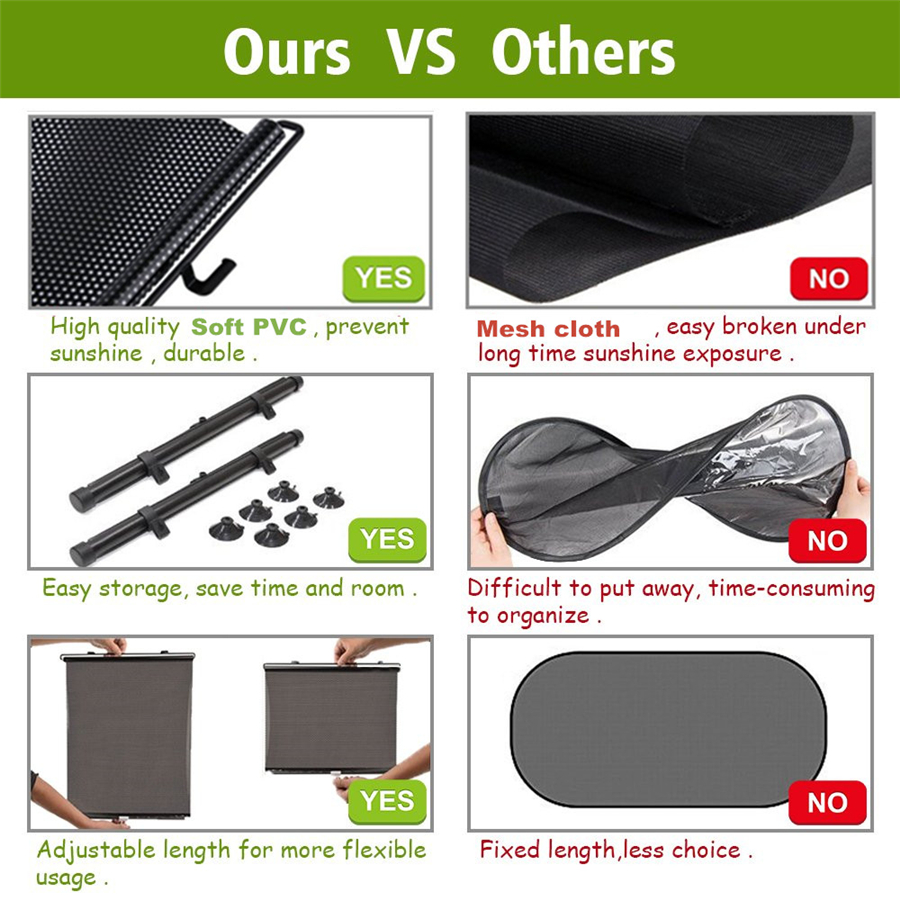 - Fearless Sun Exposure --They are long lasting and durable.Made from high quality PVC plastic. They will not disintegrate in the sun’s heat.Effectively block the sun and create a cool shade for the car. Prevent the interior seat, plastic, leather and other decoration from fading and cracking due to exposure