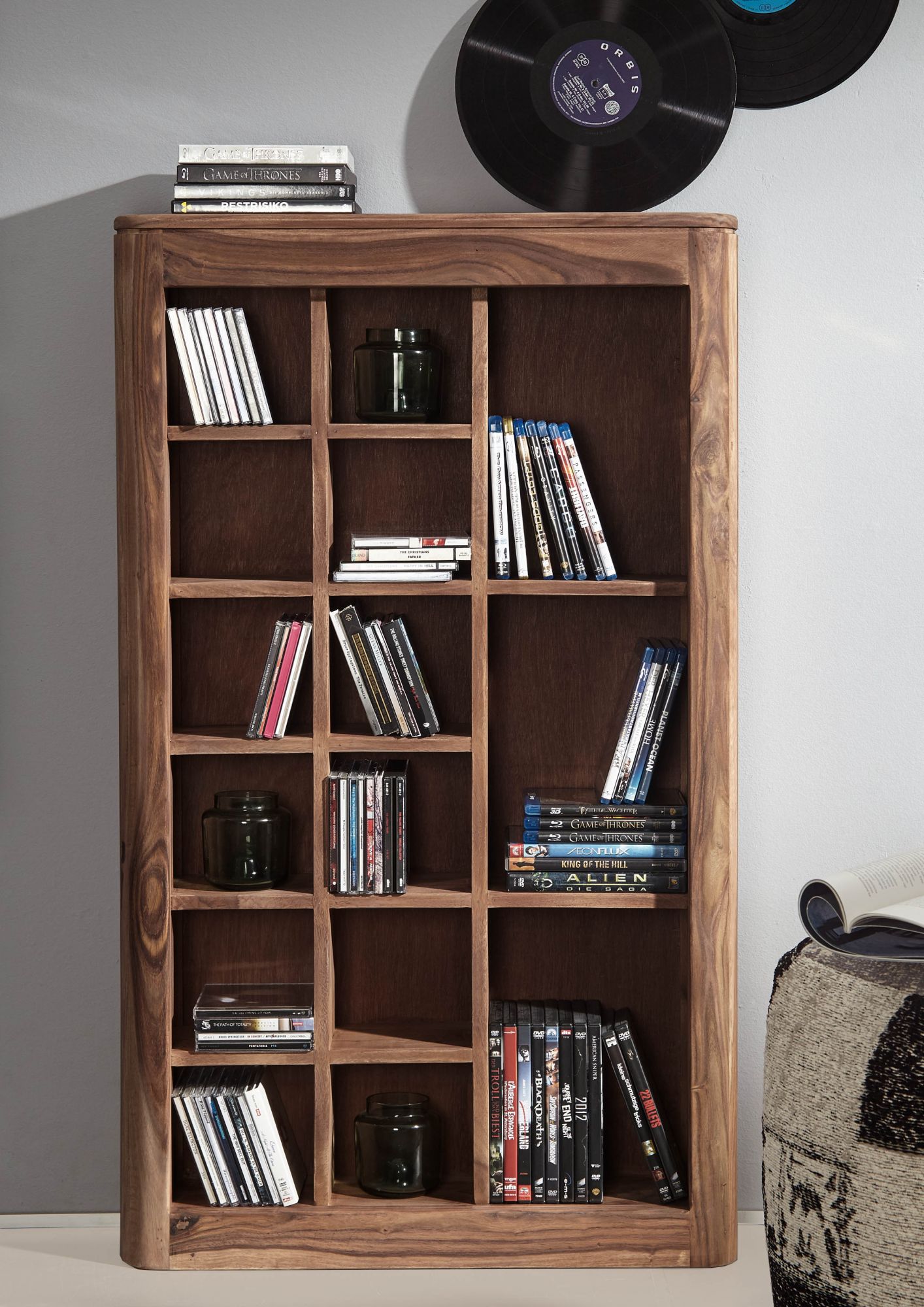 - Stauraum in 12 offenen Regaleinheiten – passend für CDs