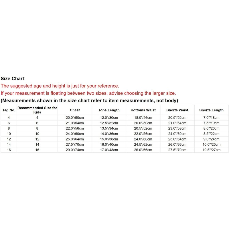 | Tag No. | Recommended Size | Chest | Tops Length | Bottoms Waist | Shorts Waist | Shorts Length |