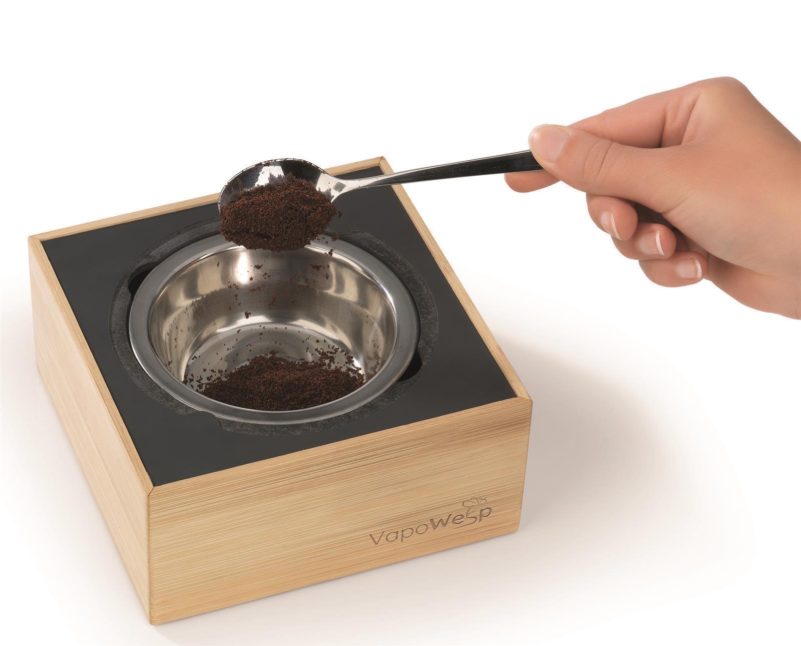 In die feuerfeste VapoWesp Räucherbox kann das Kaffeepulver eingefüllt, mit VapoPulver vermischt und angezündet werden. Durch die speziellen, natürlich duftenden VapoWesp Kräutermischungen wird das glimmende Kaffeepulver, welches normalerweise nach einiger Zeit unangenehm riecht, angenehm aromatisiert. Die variabel einstellbaren Deckelöffnungen sorgen dafür, dass der Rauch je nach Bedarf reguliert werden kann.