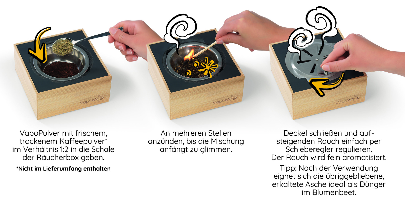 Zuerst 2 gehäufte TL frisches, trockenes Kaffeepulver und 1 gehäuften TL VapoPulver mischen und in den Edelstahlbehälter der Räucherbox einfüllen. Zünde die Mischung dann mit einem Stabfeuerzeug an mehreren Stellen an. Diese Menge räuchert ungefähr eine Stunde. Es kann ein wenig dauern, bis es anfängt zu glimmen – habe deshalb etwas Geduld. Erst wenn Rauch aufsteigt, setzt du den Edelstahldeckel mit geöffnetem Schieber auf, damit das Pulver genügend Sauerstoff erhält. Mit dem Schieberegler kannst du den aufsteigenden Rauch regulieren. Nach der Verwendung in der Räucherbox eignet sich die übriggebliebene, abgekühlte Asche übrigens auch ideal als Dünger im Blumenbeet.