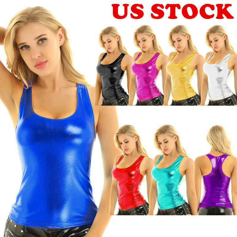 Fashion Metallic Shiny Sleeveless Crop Top Crew Neck T-shirt Vest Tops for Women.