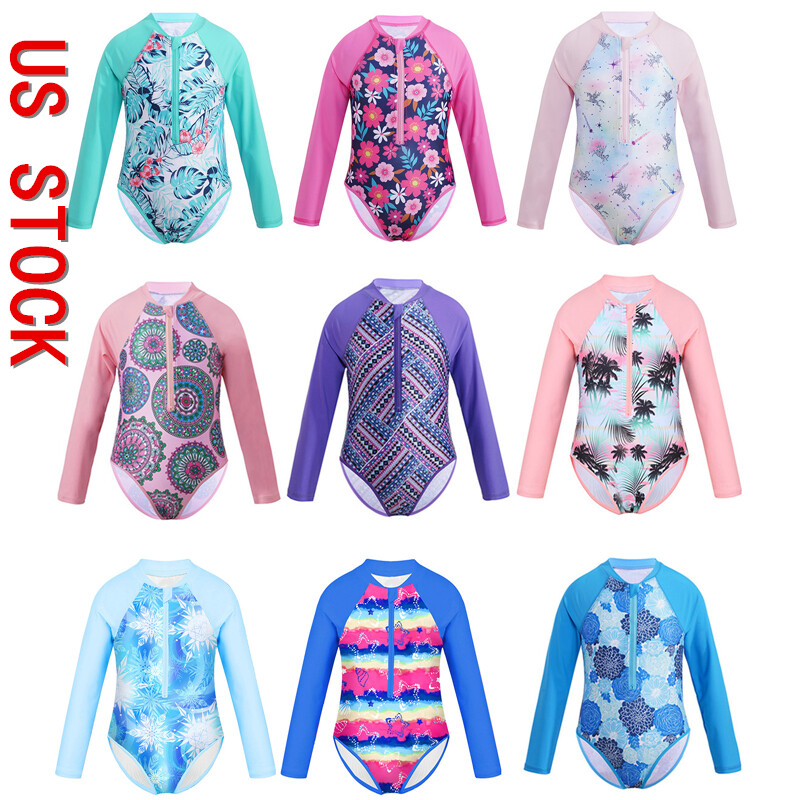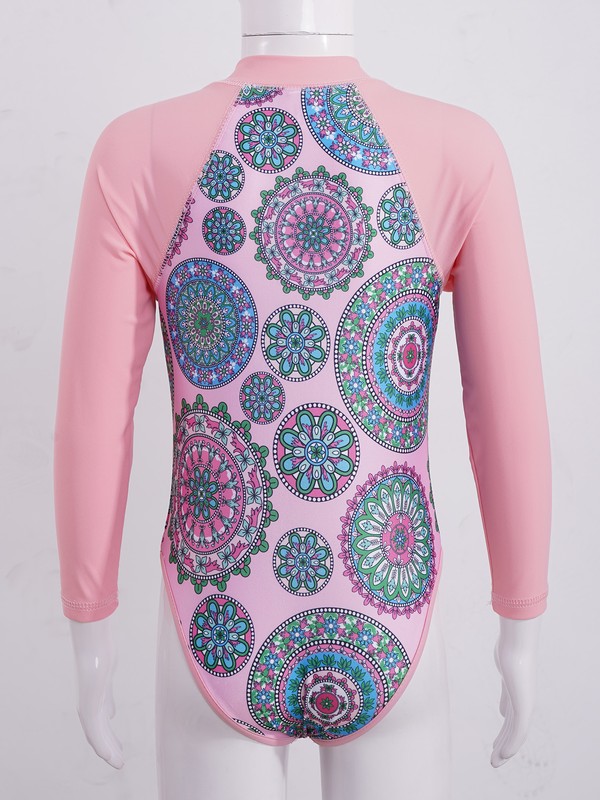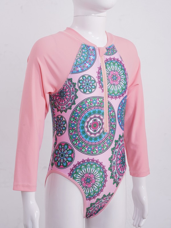 Kids Girls Round Neck Long Sleeves Multicolor Print Patchwork Design Jumpsuit Swimwear.