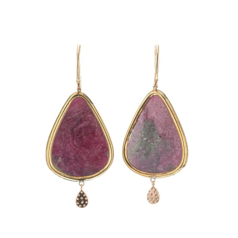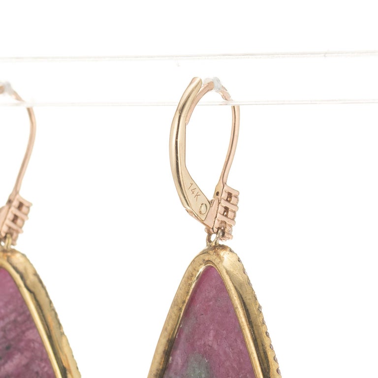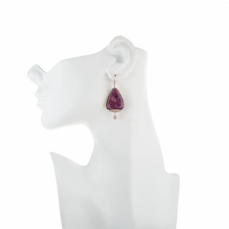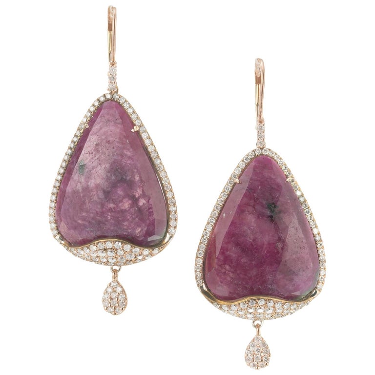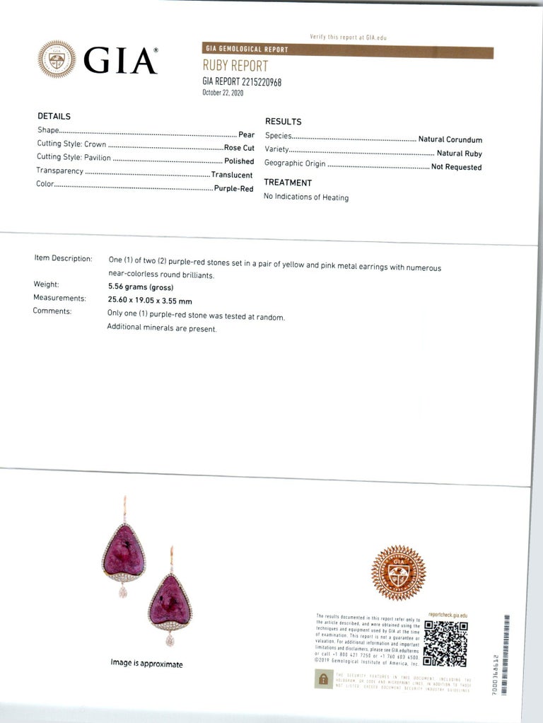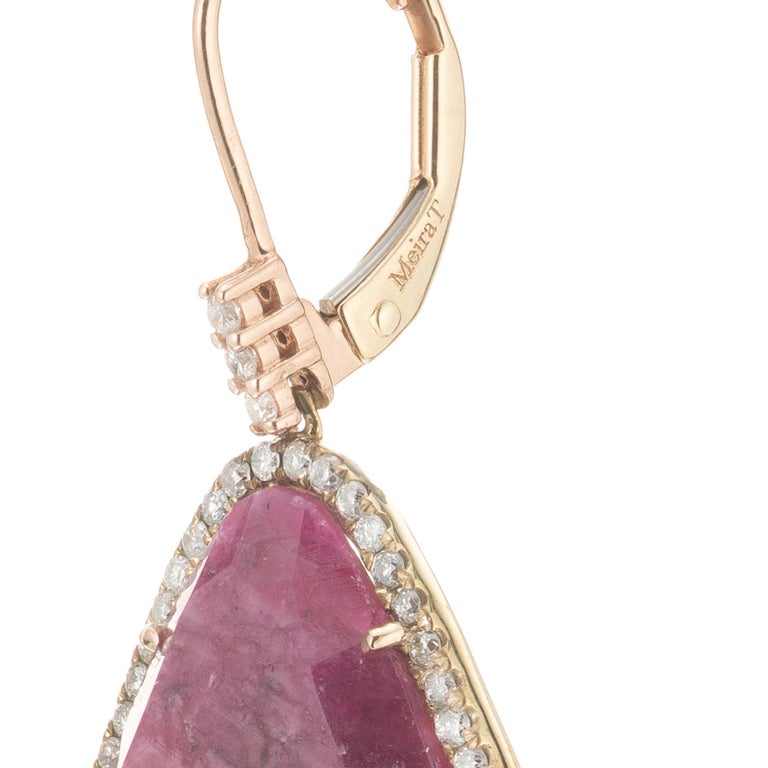 Meira T ruby and diamond dangle earrings. Natural 34.38ct ruby stones with 148 round diamonds set in 14k rose gold with pear shaped diamond cluster dangles. One ruby stone was randomly chose for testing by the GIA, certified natural, no heat stone.
