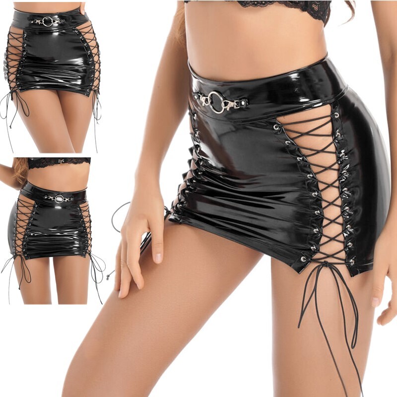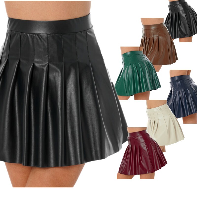 Glossy appearance, solid color, high waist mini skirt with elastic waistband for comfy fit.