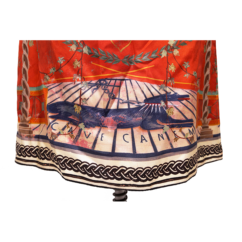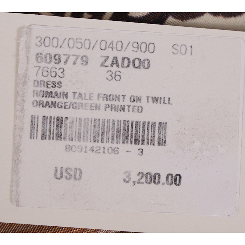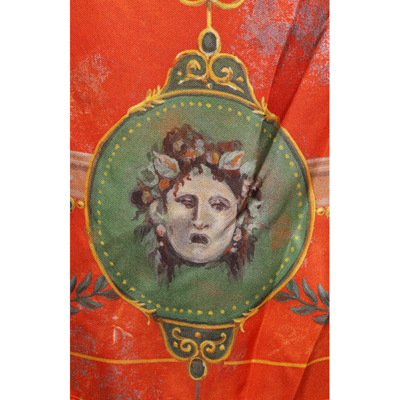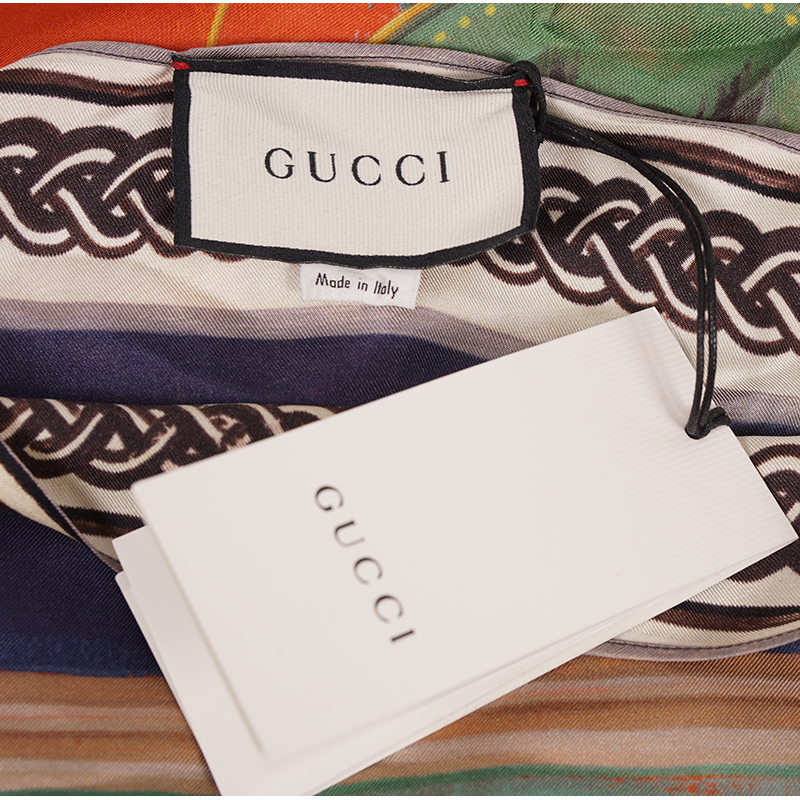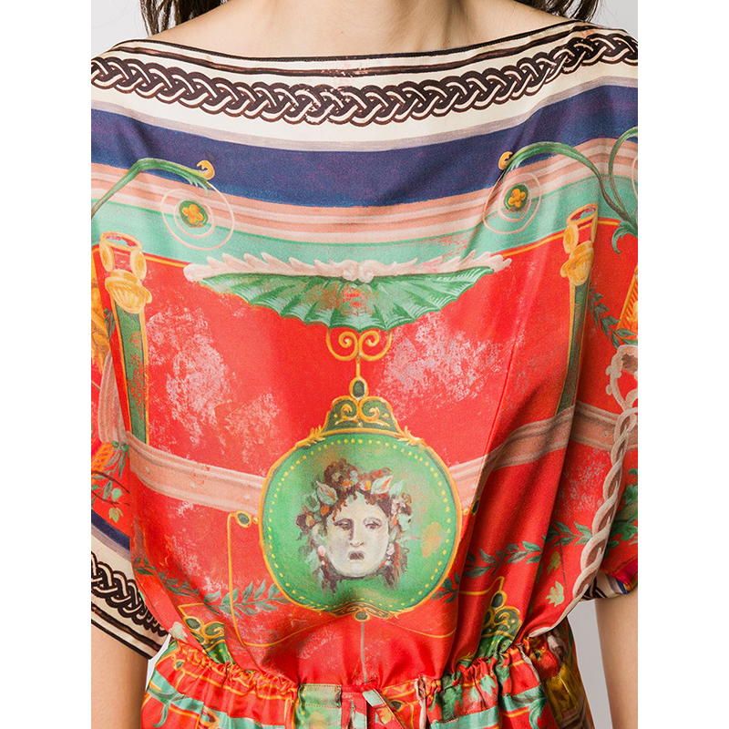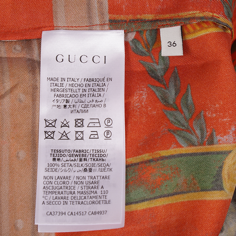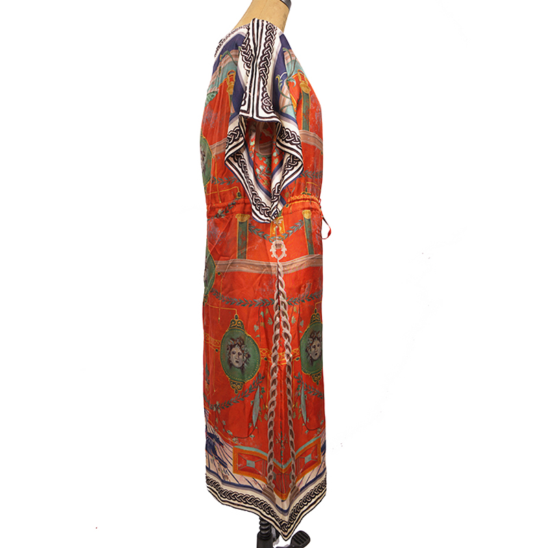 Authentic Gucci dress in an Greek inspired print. Orange silk twill with green Romain Tale print. Straight neck. Short sleeves. Drawstring waist. Mid-length. Unlined. 100% silk. Style 609779. Made in Italy. Great little vacation dress, sure to get noticed.