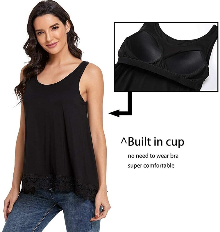 - This sleeveless tank tops with built in bra has an oversized fit and extra large, flared wide hem that drapes away from the body. Delicate crochet floral lace applique details along the hem of the tank top for a elegant and flowy effect.