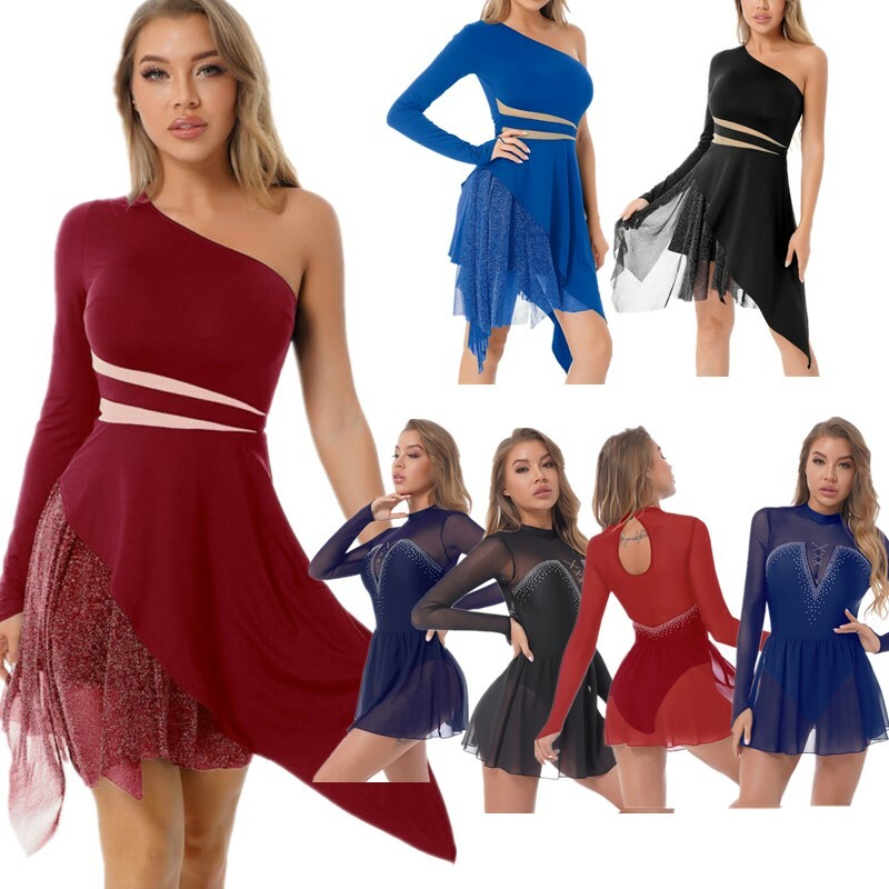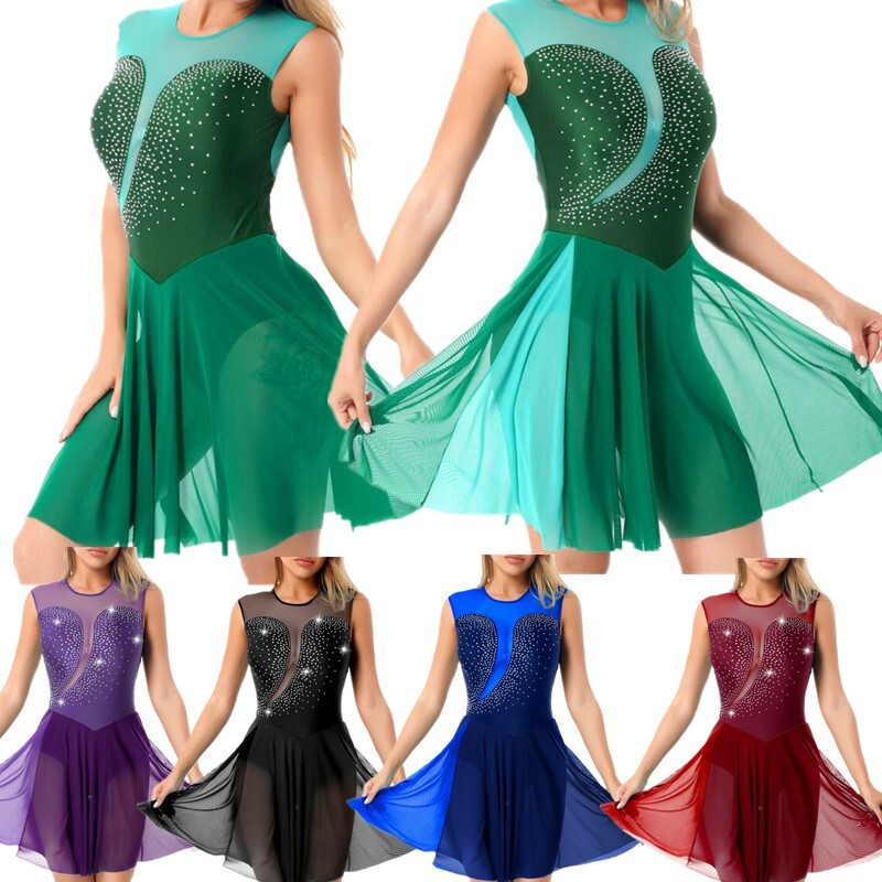 Women Rhinestone Figure Skating Dress See-through Mesh Patchwork Ruffle Skirted Leotard.