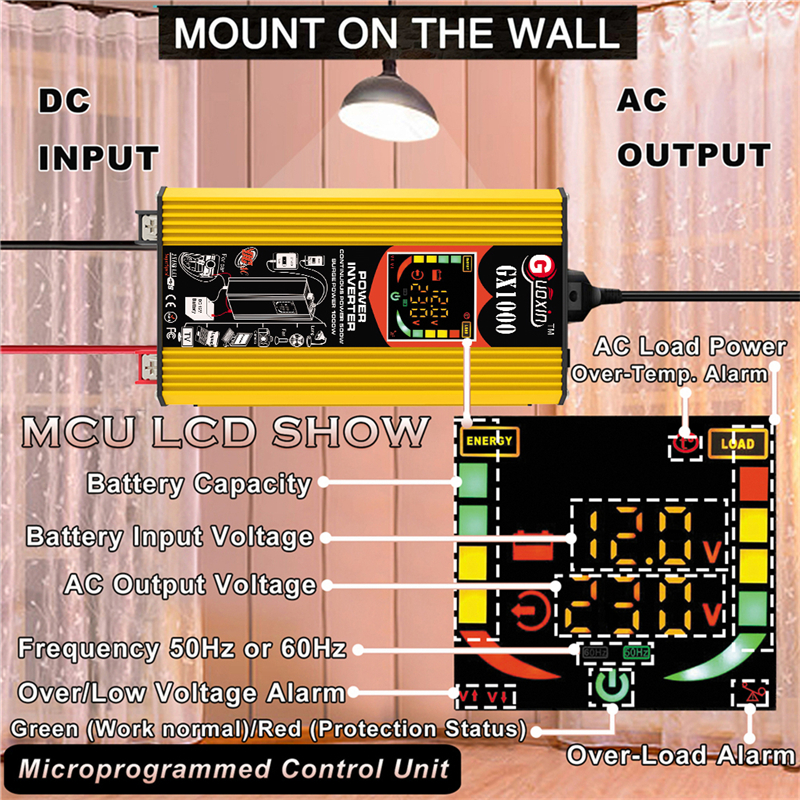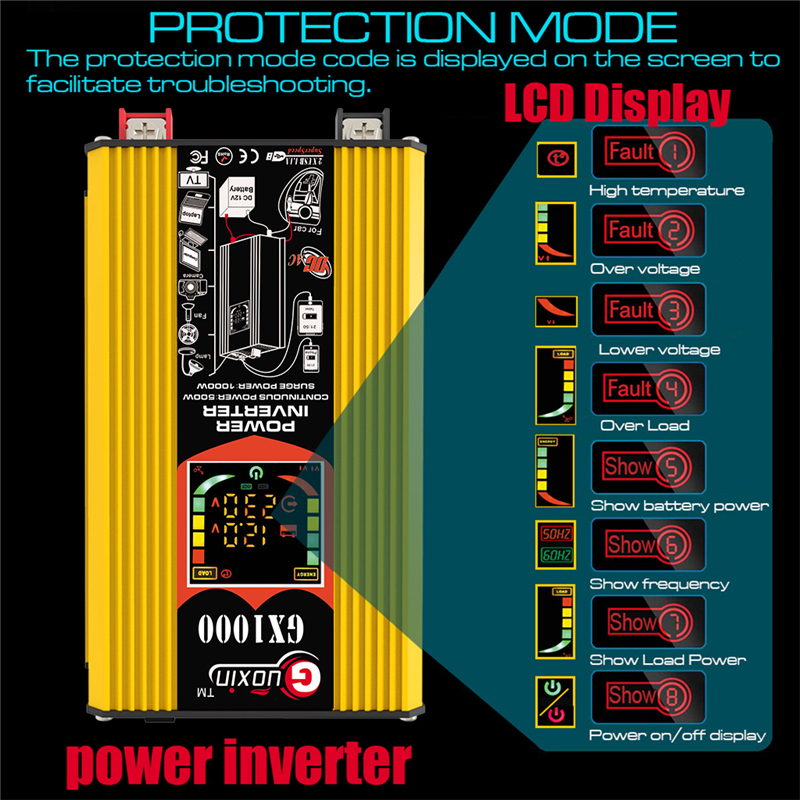 [MCU LCD Display] Car inverter has the micro-control unit LCD realizes the exchange of human-machine information, and can know the working status of the inverter in real time, including show real time of input voltage, output voltage, output frequency, battery power, load, Power on/off indicator and other information.