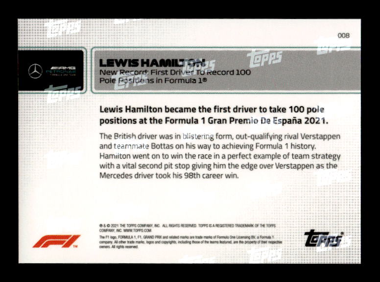 2021 Topps Now Formula 1 #8 Lewis Hamilton First Driver To Record 100 Poles