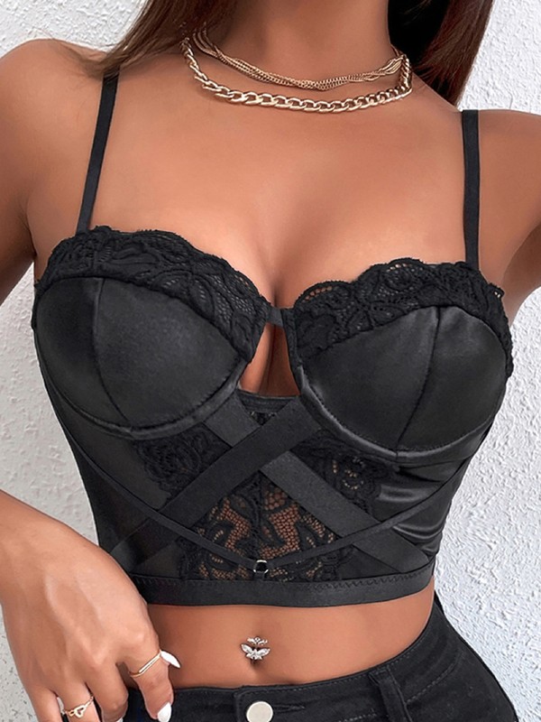 Spaghetti strap, see-through floral lace and satin patchwork design to make you hot and attractive.