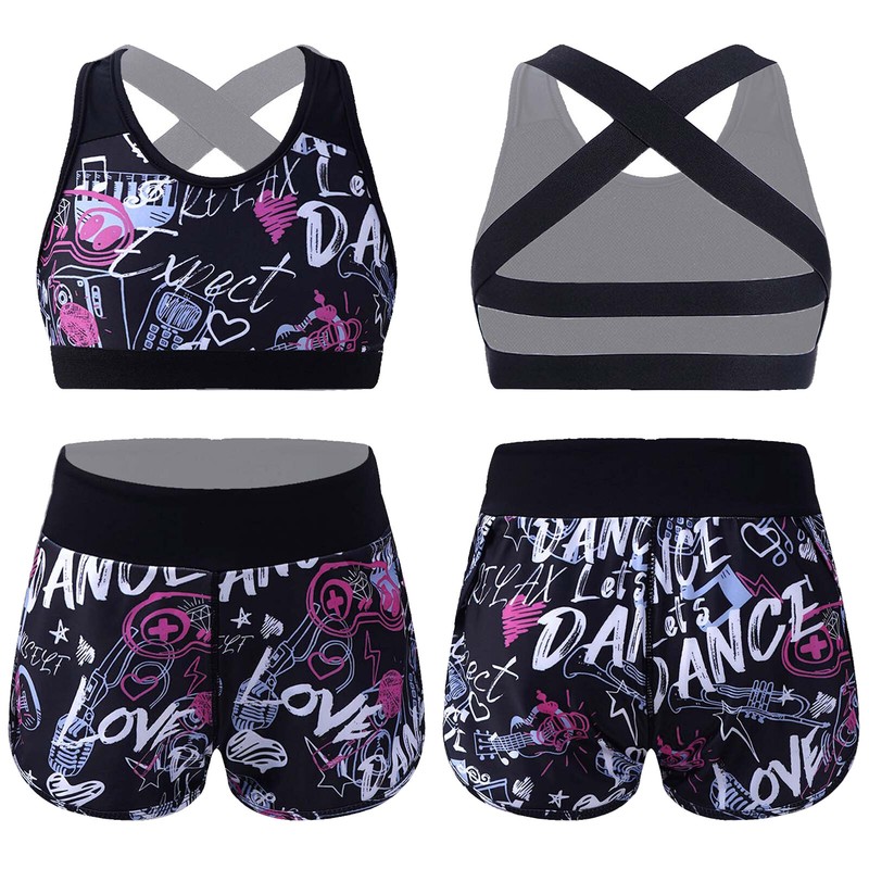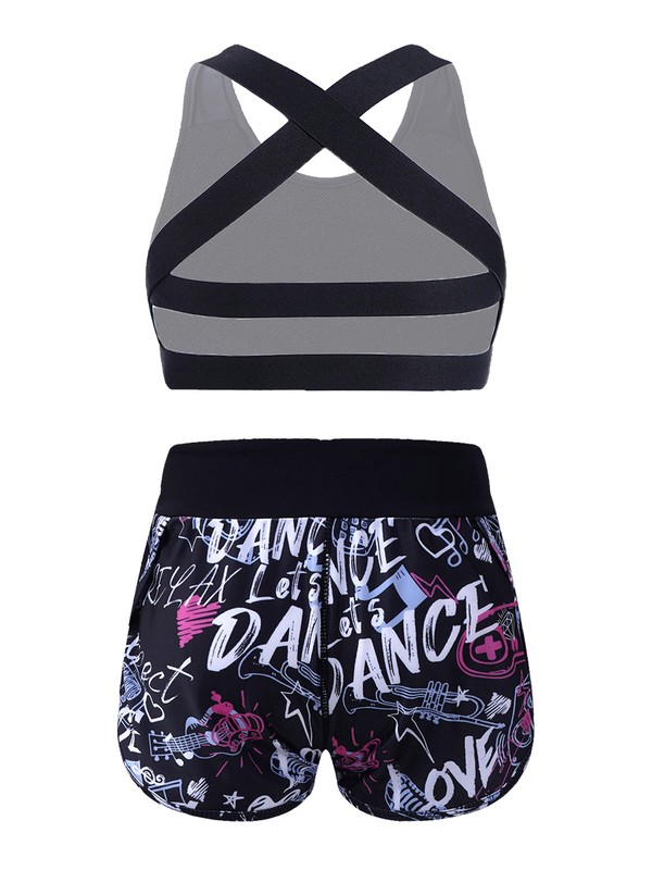 2Pcs Kids Girls U Neck Elastic Straps Criss Cross at Rear Open Back Sport Vest and Shorts Set.