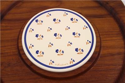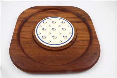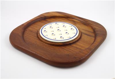 Has a round metal cheese tile with a floral design