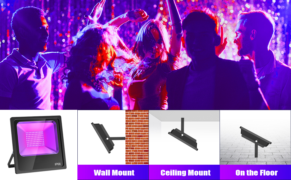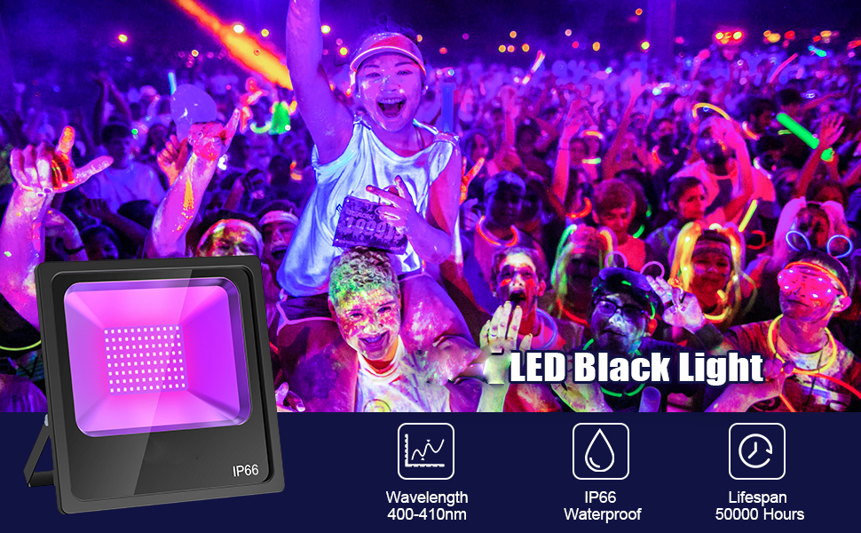 DURABLE & EASY INSTALLATION: Die-cast aluminum housing, shock and erosion resistant. 50,000+ hours lifespan for LEDs,durable and energy efficient. Low heat, low power consumption. With US plug, the black light can be used anywhere with a power outlet, No need for wiring. Easy to position with adjustable bracket.