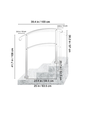 As a great helper for your family members to go up and down the stairs, this wrought iron handrail fits 3 steps. It spans max 3 stair risers and measures 25"/63.5 cm post to post.