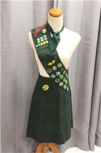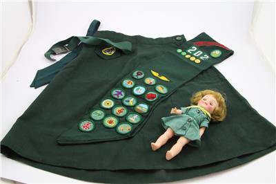 Lot include: Skirt with side zip, button & label, tie, sash with badges, stretchy belt & an Effanbee "Fluffy" doll