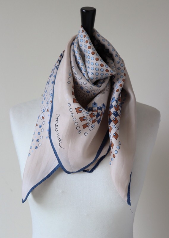 Meunier vintage twill silk scarf in cream with a blue and brown geometric spotted pattern.