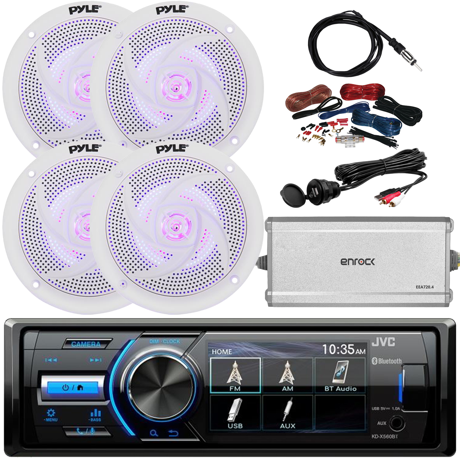 PACKAGE BUNDLE INCLUDES: JVC KD-X560BT Marine Motorsports Stereo Digital Media AM/FM Bluetooth Radio Receiver, 4 x Pyle PLMRS43WL 4" 2-Way Marine 100W Audio LED Speakers, Enrock EEA720.4 Elite 4-Channel 45 Watts RMS Marine/Powersports Amplifier, Pyle PLMRAKT8 Marine Grade 8 Gauge Amplifier Installation Kit, Enrock EKMR2 Marine Universal Wired AM/FM 40" Radio Antenna, Enrock USBAUX2RC Universal USB/3.5MM Auxiliary Interface Mount For Stereo Radios.