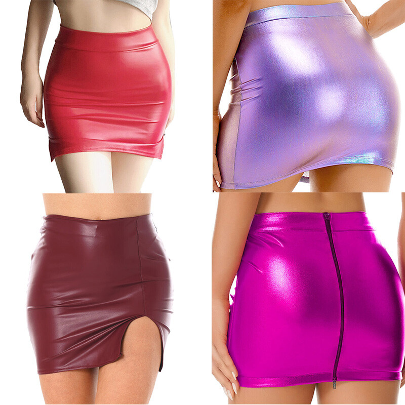 Glossy appearance, above knee length, with elastic waistband for comfy fit.