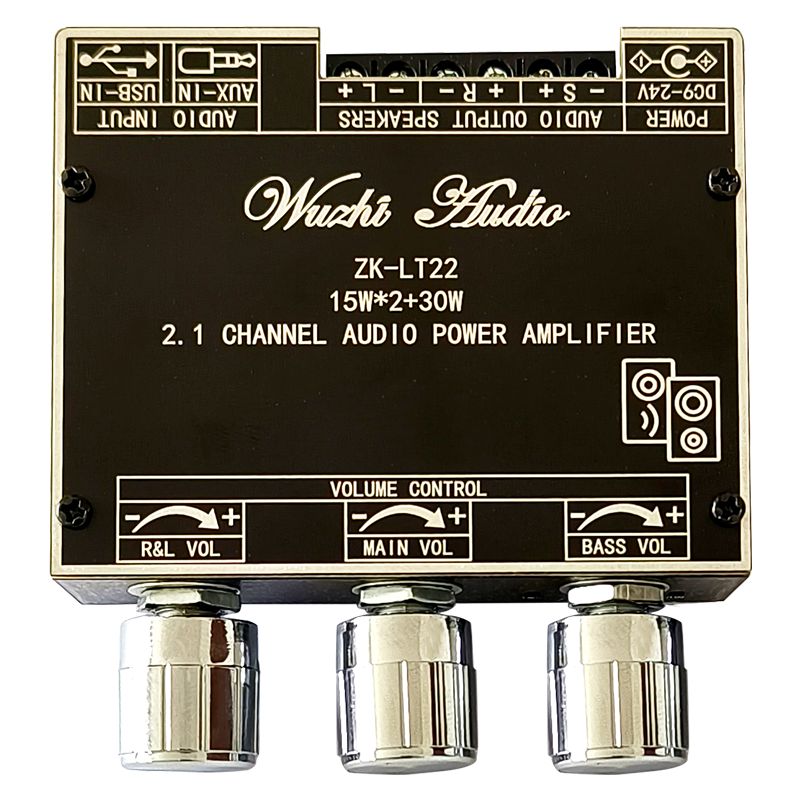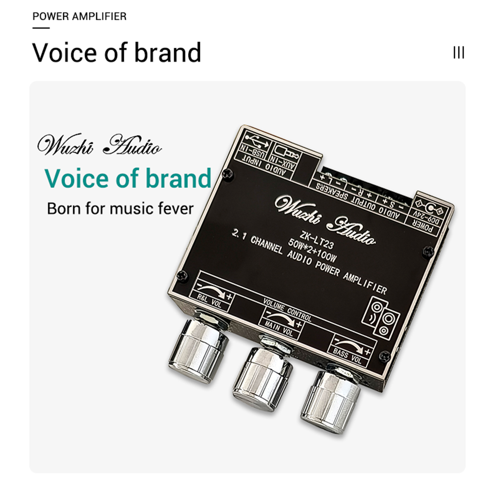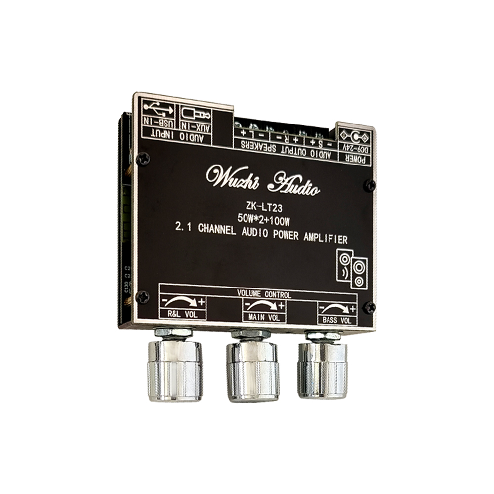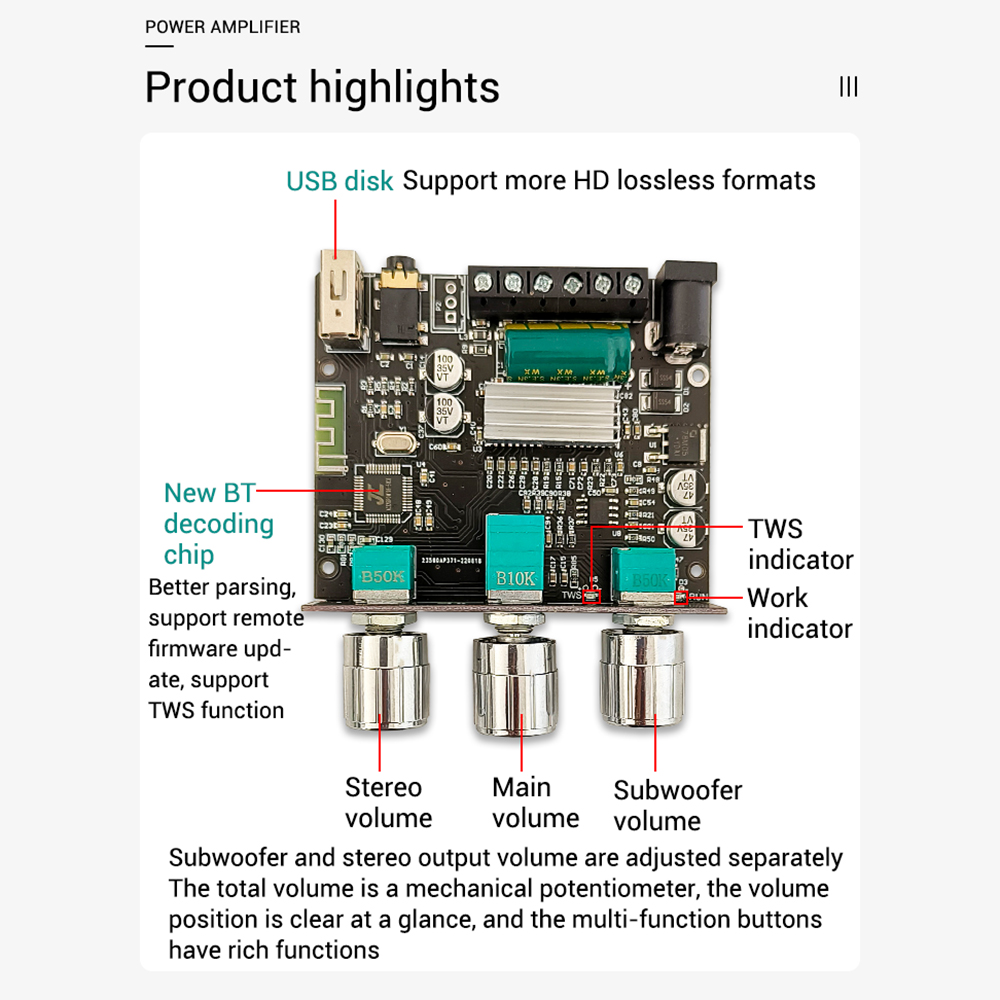 Name: 2.1 channel 50W*2+100W subwoofer adjustment bluetooth audio power amplifierPower amplifier chip: domestic chipBluetooth version: 5.1Bluetooth transmission distance: 10 metersAudio input: Bluetooth+AUX+U disk+USB sound cardAudio output: left channel 50W + right channel 50W + subwoofer 100WAdapter power supply: DC9-24V, ≥5A (can not be connected to AC)Adapter speakers: left and right channels 10-50W, 4-8Ω; subwoofer 20-50w, 4-8ΩVolume adjustment: total volume, stereo volume, subwoofer volume are adjusted separately, with a wide range of adjustment;Master volume with button click: play/pause double click: next songTriple tap: select or deselect box modeProtection mechanism: over temperature, over current, short circuit, anti-static protectionFeatures: Support Wuzhi Audio APP. Modify the bluetooth name, password settings, promptsTone volume adjustment, on/off alert tone, sleep aid, firmware upgrade, etc. Box pairing function, the true wireless function enables two sets of speakers to be combined into left and right channel pairing boxes, with a stronger sense of spatial positioning.Product size: 75x70x20mmProduct weight: net weight 78g, including packaging 125g