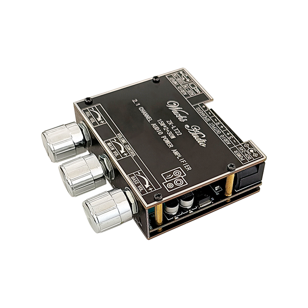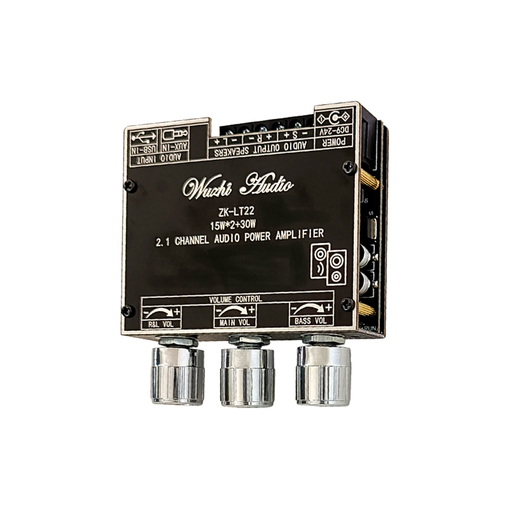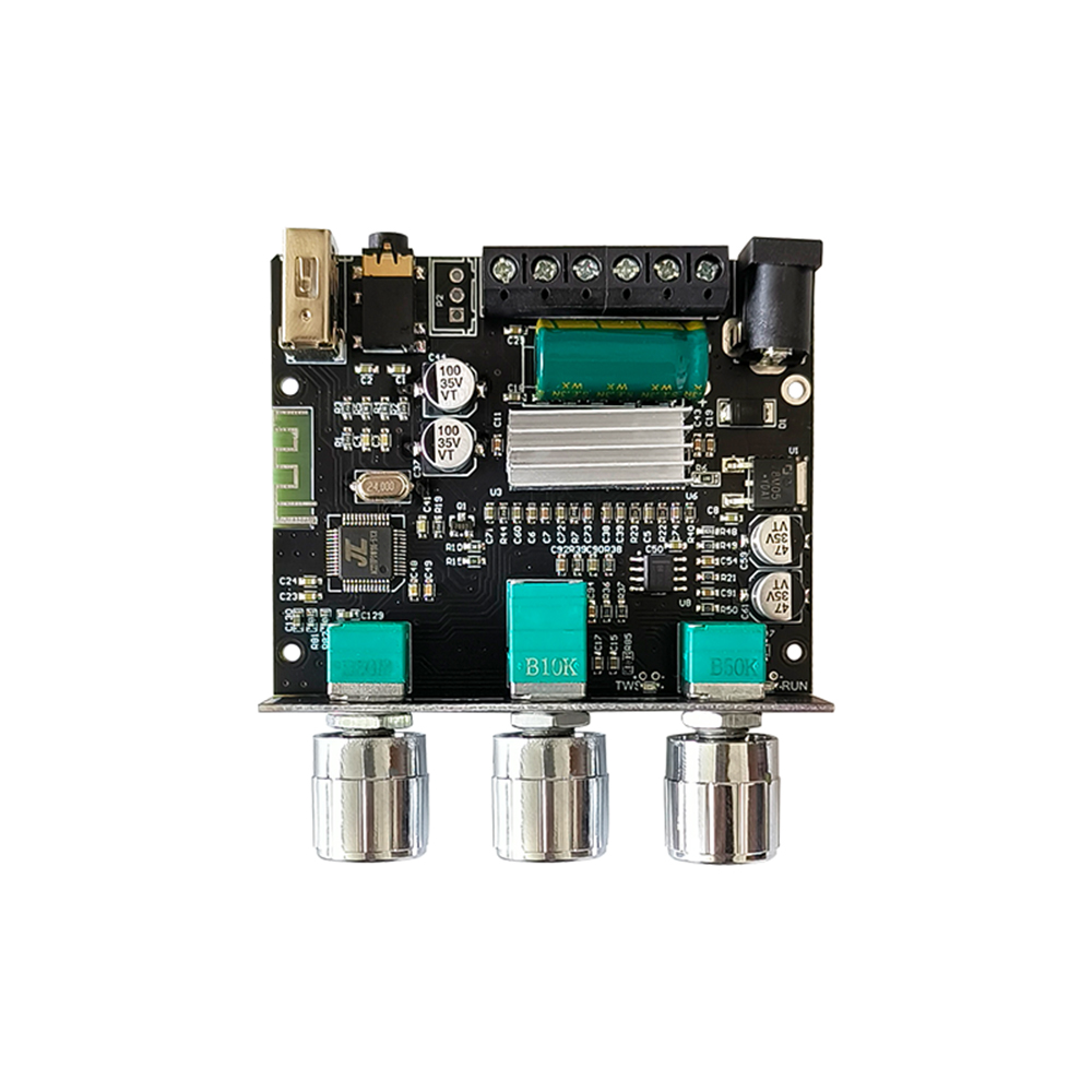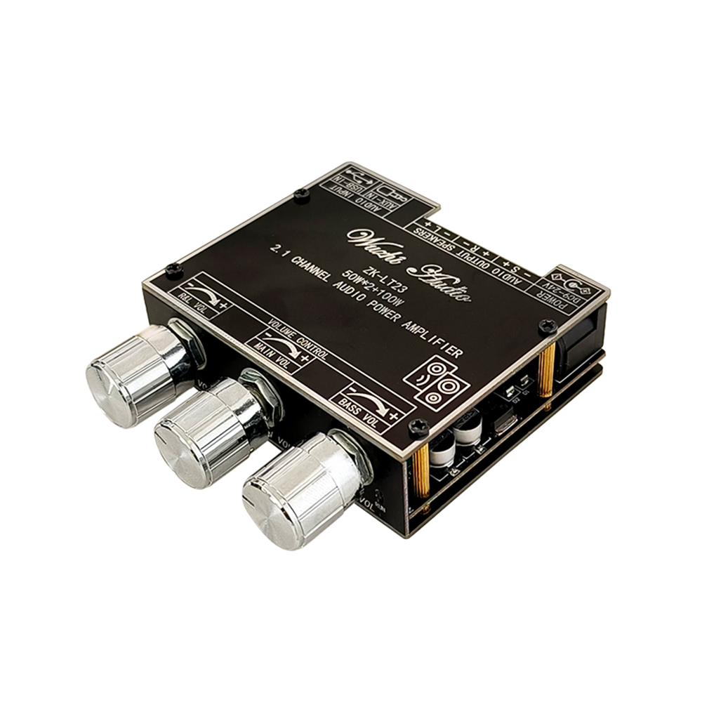 Name: 2.1 channel 50W*2+100W subwoofer adjustment bluetooth audio power amplifierPower amplifier chip: domestic chipBluetooth version: 5.1Bluetooth transmission distance: 10 metersAudio input: Bluetooth+AUX+U disk+USB sound cardAudio output: left channel 50W + right channel 50W + subwoofer 100WAdapter power supply: DC9-24V, ≥5A (can not be connected to AC)Adapter speakers: left and right channels 10-50W, 4-8Ω; subwoofer 20-50w, 4-8ΩVolume adjustment: total volume, stereo volume, subwoofer volume are adjusted separately, with a wide range of adjustment;Master volume with button click: play/pause double click: next songTriple tap: select or deselect box modeProtection mechanism: over temperature, over current, short circuit, anti-static protectionFeatures: Support Wuzhi Audio APP. Modify the bluetooth name, password settings, promptsTone volume adjustment, on/off alert tone, sleep aid, firmware upgrade, etc. Box pairing function, the true wireless function enables two sets of speakers to be combined into left and right channel pairing boxes, with a stronger sense of spatial positioning.Product size: 75x70x20mmProduct weight: net weight 78g, including packaging 125g