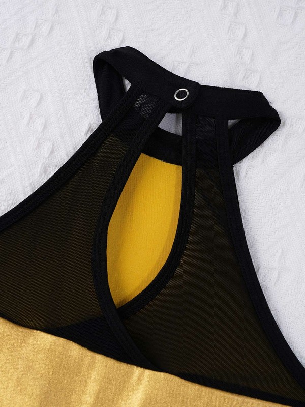 The leotard features with sleeveless and round collar, one button closure at the back, oval shape hollow back, long pants style.