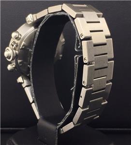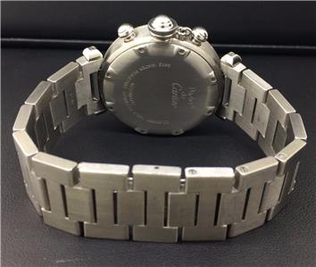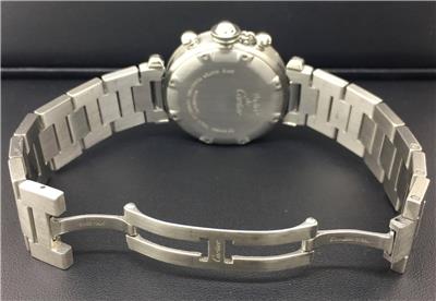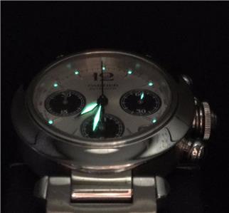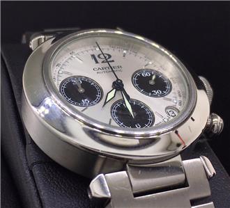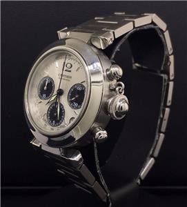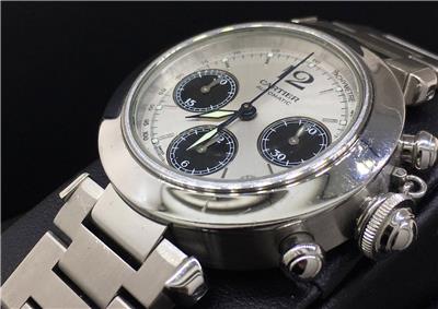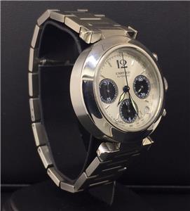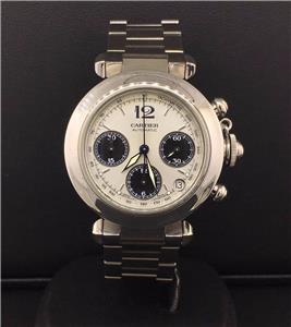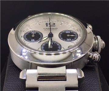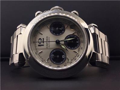 Cartier Pasha Chronograph Automatic in stainless steel. 35mm size diameter, very nice size overall. This watch sits solid on the wrist and you get a sense of luxury and quality immediately. This Pasha features a date 3rd and 4th hour mark. Silver dial with black chronograph indicators.