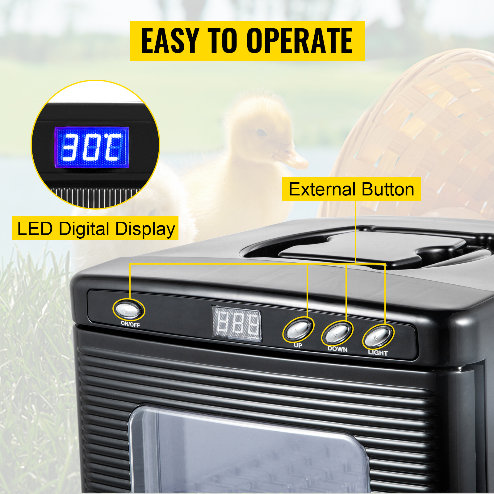 The egg incubator is designed with a visible PVC door for better observation. Besides, the built-in handle and 13lbs weight make it portable.