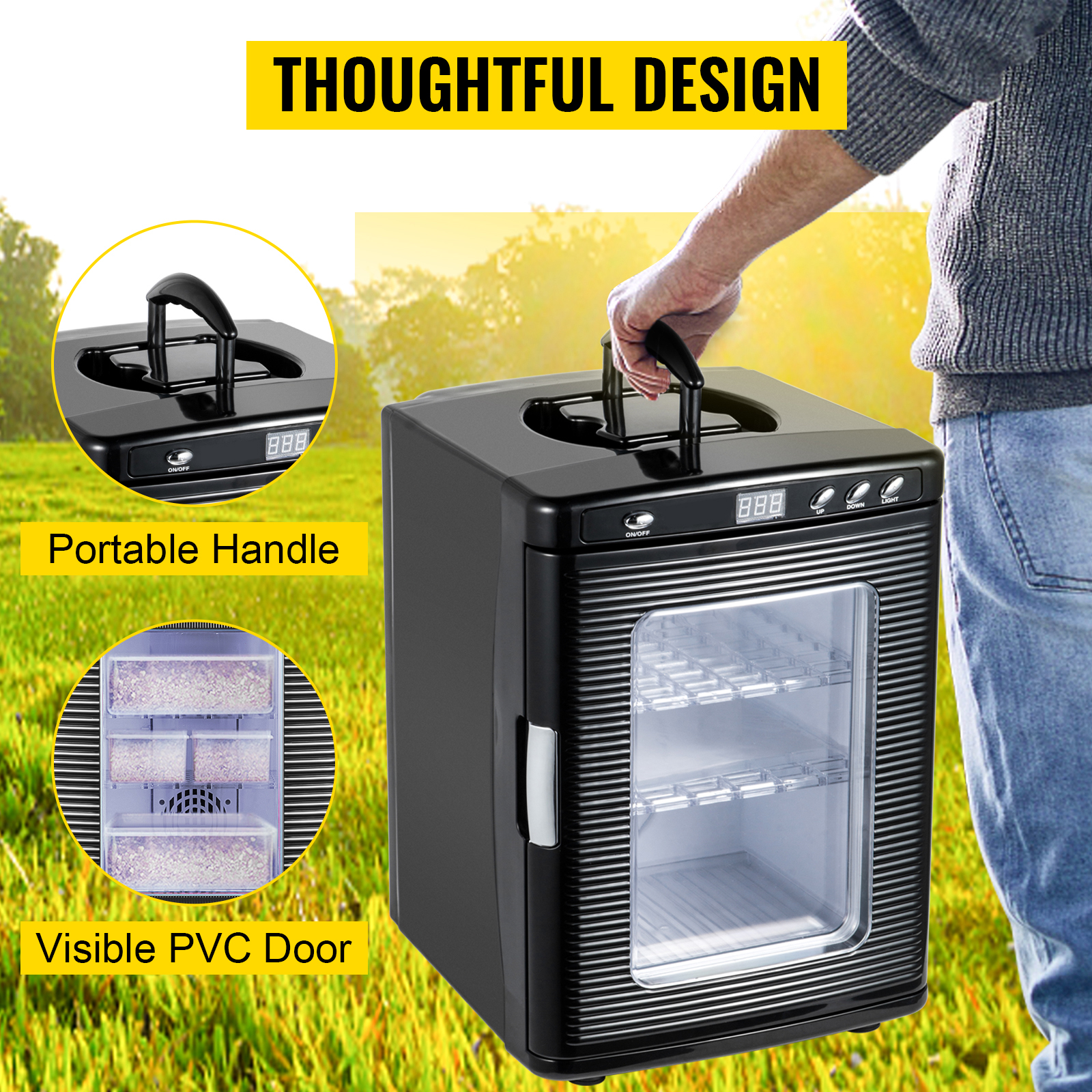 This incubator functions as both a cooler and a warmer by means of a thermoelectric system. Its interior volume is 25 L and can accept bottles and flasks up to 2 L, two removable shelves included. The incubator can accurately monitor the temperature inside and display it on the LED panel. In addition to hatching or transporting reptiles, it can also be used as a refrigerator for food or drink.