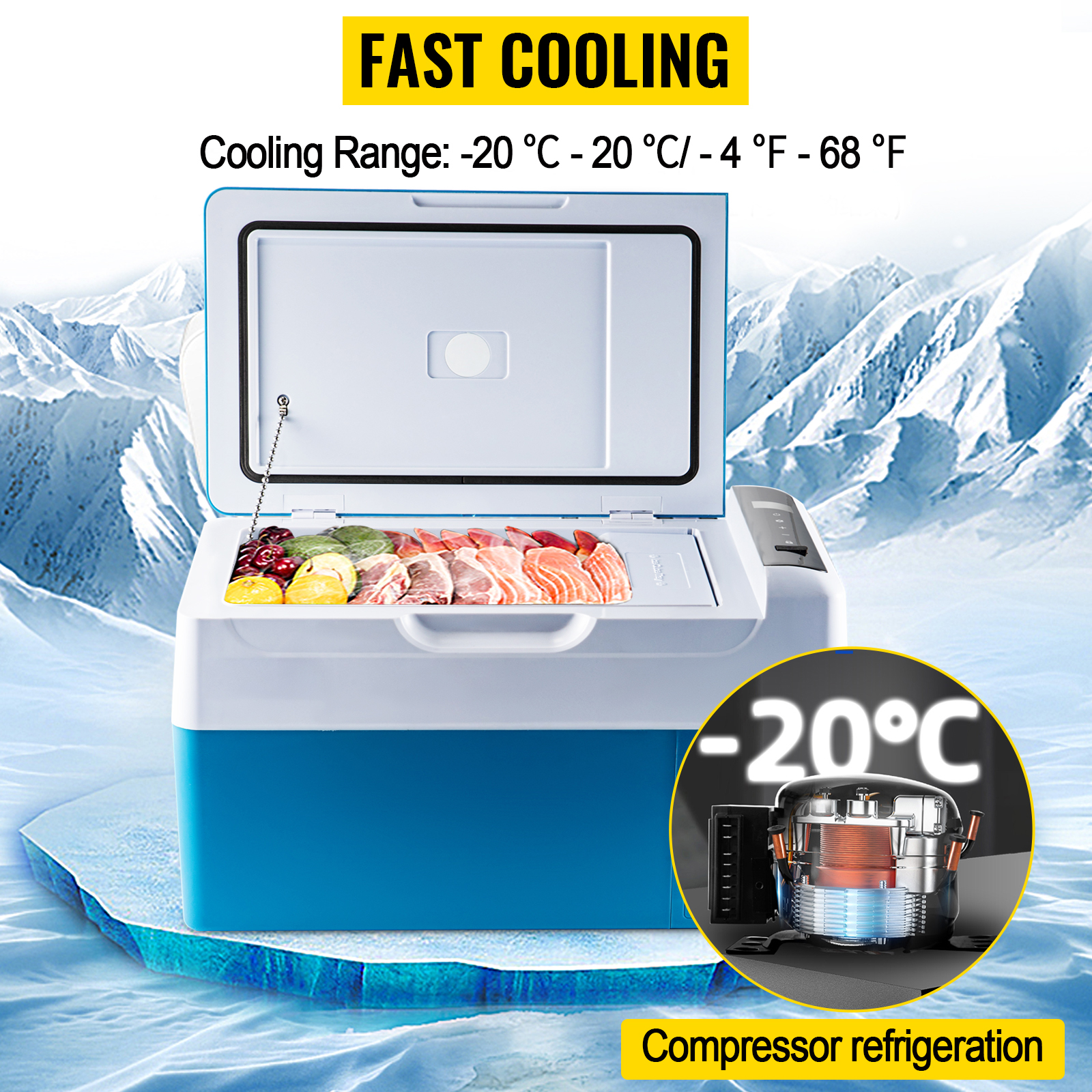 Unser Autokühlschrank hat eine schnelle Kühlgeschwindigkeit und kann schnell von 20 ℃ auf 0 ℃ in 15 Minuten fallen. Und es kann für 10 Stunden nach dem Ausschalten der Stromversorgung dauern, sodass Sie köstliche und frische Lebensmittel während der Reise genießen können.