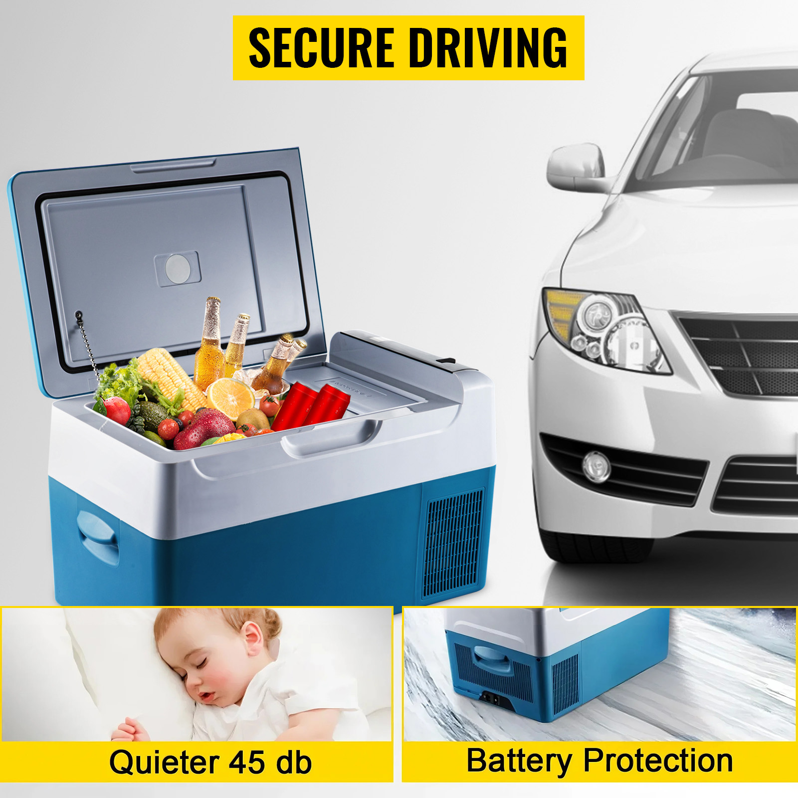 Ein dreifacher Batterieschutz verhindert, dass der Kühlschrank die Autobatterie entlädt. Es ist leise und sorgt dafür, dass Sie nach einer langen Reise gut schlafen können. Der Kühlschrank kann auch stabil gehalten werden, indem er um 45° gekippt wird.