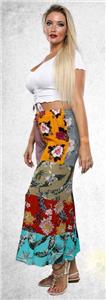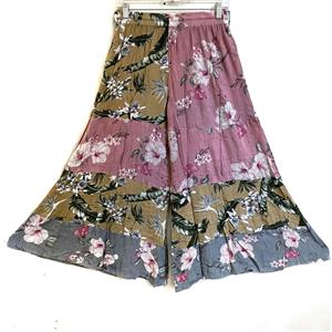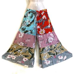 Artsy clothing for creative people who aren't afraid to show a little color! 100% Rayon no match patchwork tiered palazzo pants with elastic waist and drawstring, NO pockets. The fabric on these pants have a really nice drape and would look beautiful with a flowy bohemian peasant top. The model is just to show what the item looks like on, but the item hanging in the separate picture is the exact pattern you will receive. Check the measurements below.
