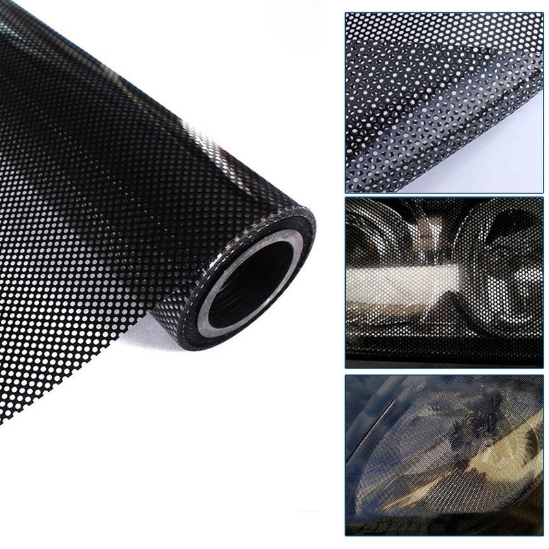 Features: -Easy removal with no glue left behind. -Water resistant, UV stable, long service life; -Can be re-applied many times without losing adhesion. -Easy to manipulate around tight curves with heat (hair drier or similar). -Gloss black in colour and perforated to allow light to easily pass through. -Vinyl is designed for use on both curved and flat surfaces, it has plenty of flexibility . Specifications: Material: single material Style: mesh Product size: 30*106cm Applicable places: car headlights package:1pcs Car Headlight Tint Perforated Film